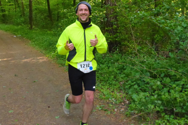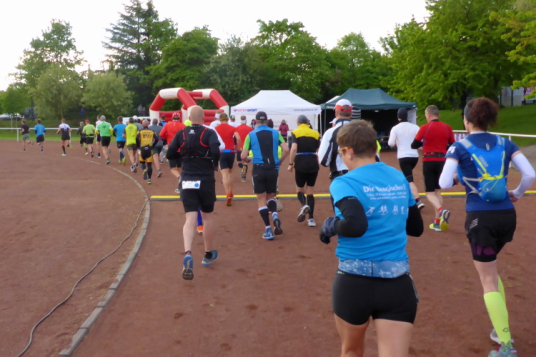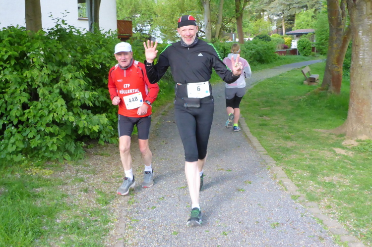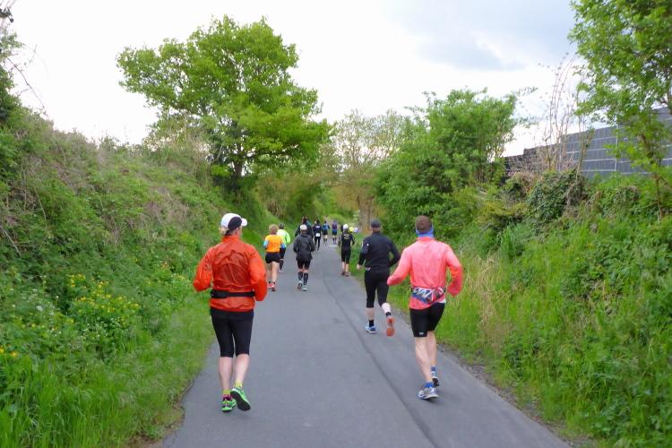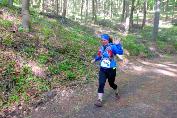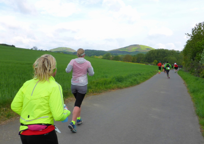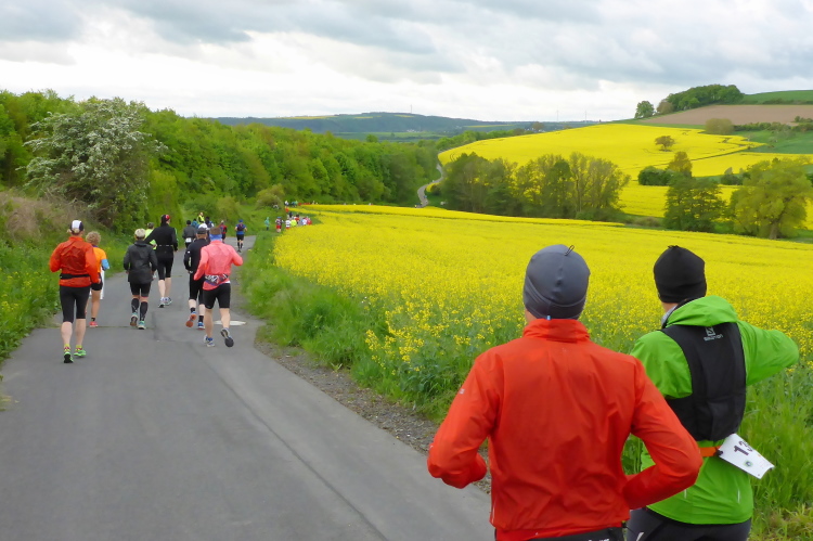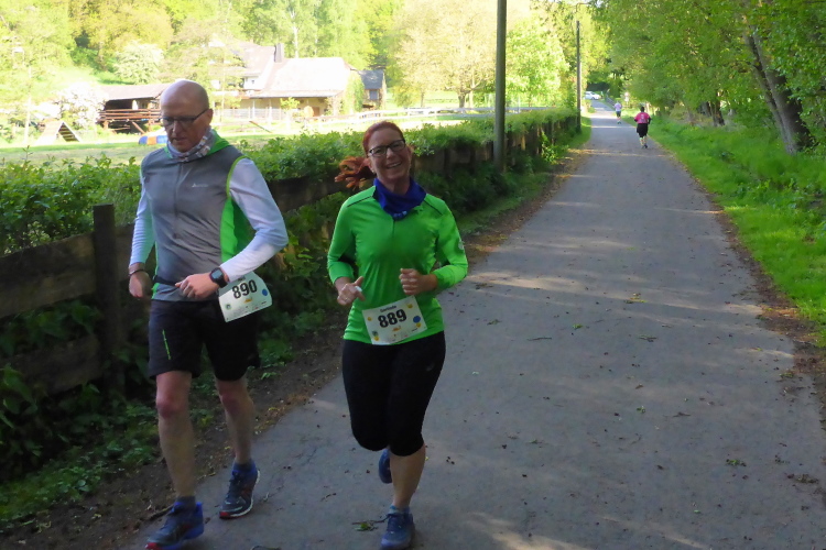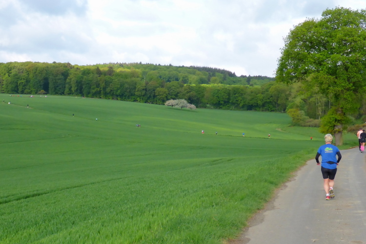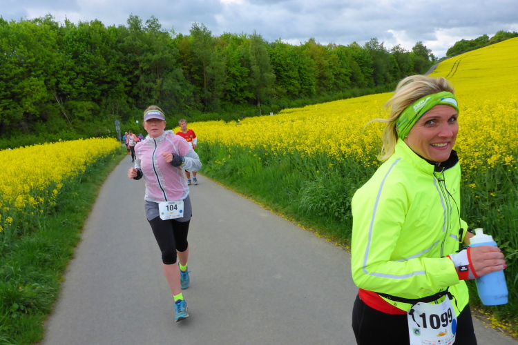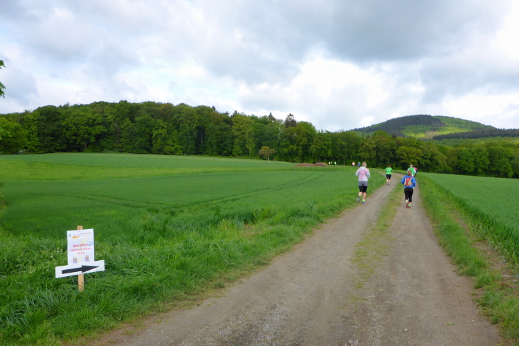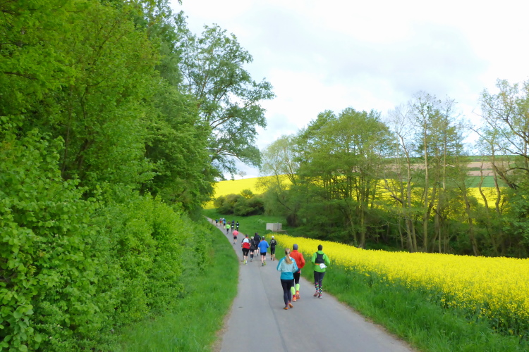 An der kleinen Bahnlinie ein lautes Hupen der Regionalbahn, hier gibt es einen unbewachten Bahnübergang. Den nehmen wir nicht, dafür ein kleines Trailstück geradeaus, wo wir auf die 5- Kilometerläufer und Teilnehmer des „Jedermannslaufes“ treffen. Ich finde es klasse, wie hier Leute animiert werden, die vorher noch nie gelaufen sind. Manche tragen Laufbekleidung, als sei noch tiefster Winter. Wenn ich die überhole, höre ich deren Raunen: „ Boah! Marathonläufer!“