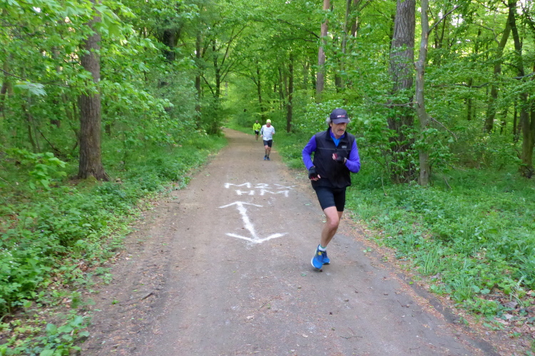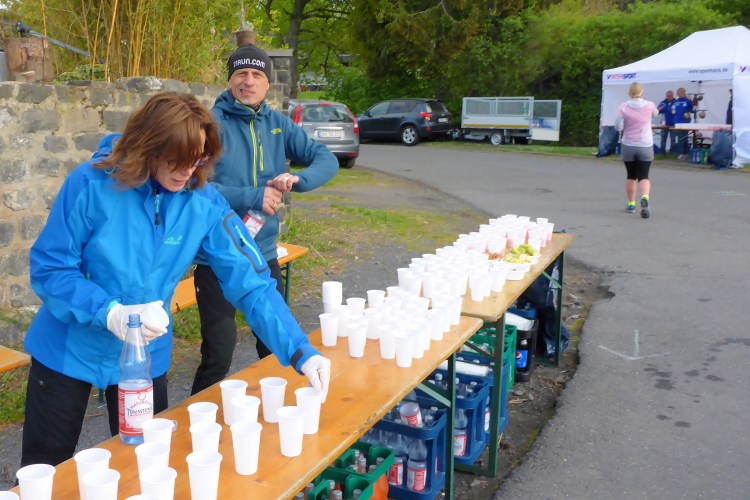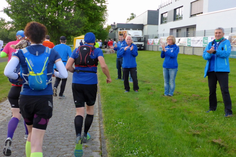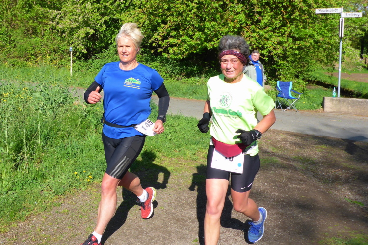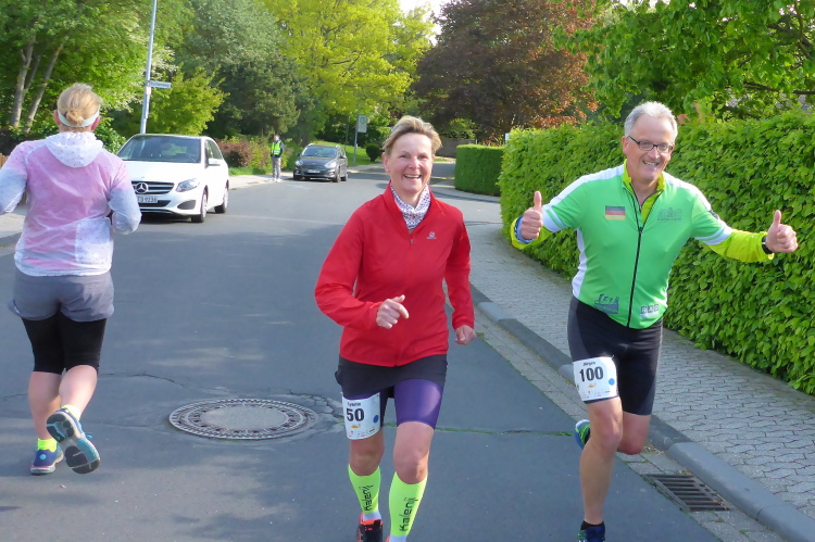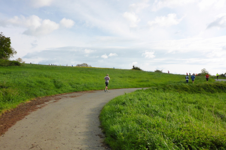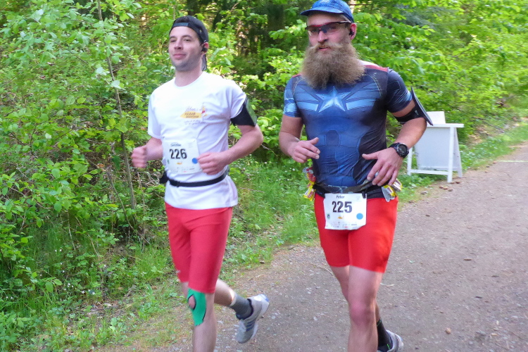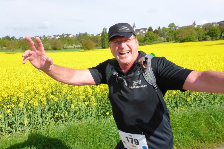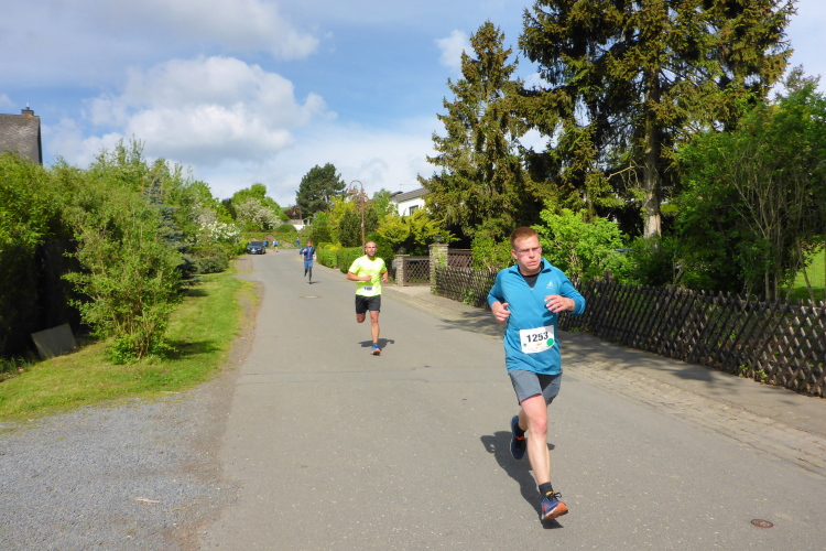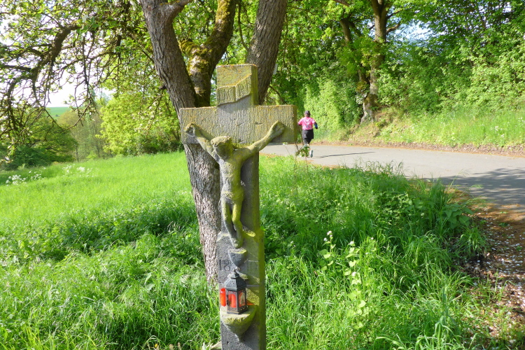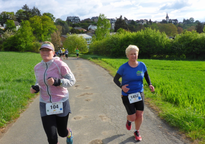 An der kleinen Bahnlinie ein lautes Hupen der Regionalbahn, hier gibt es einen unbewachten Bahnübergang. Den nehmen wir nicht, dafür ein kleines Trailstück geradeaus, wo wir auf die 5- Kilometerläufer und Teilnehmer des „Jedermannslaufes“ treffen. Ich finde es klasse, wie hier Leute animiert werden, die vorher noch nie gelaufen sind. Manche tragen Laufbekleidung, als sei noch tiefster Winter. Wenn ich die überhole, höre ich deren Raunen: „ Boah! Marathonläufer!“
