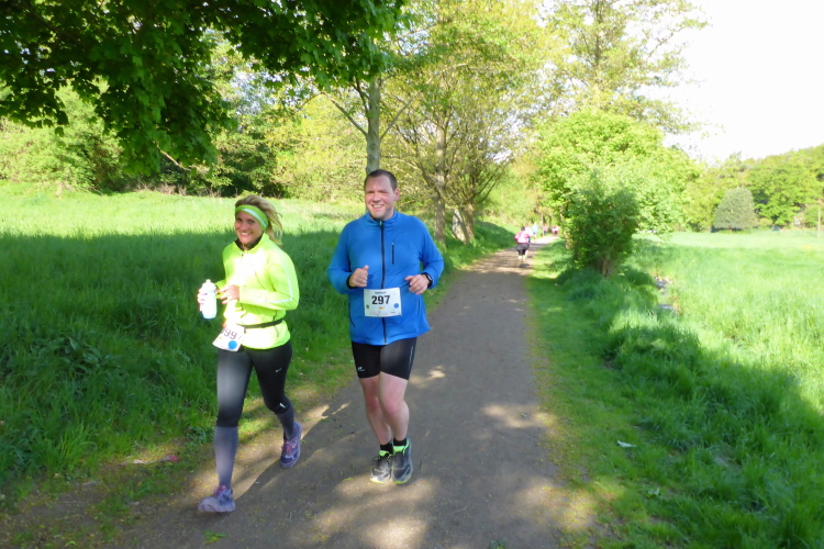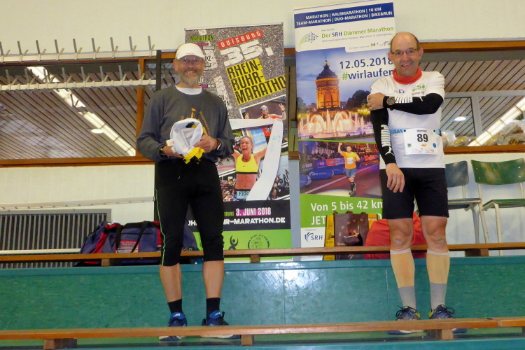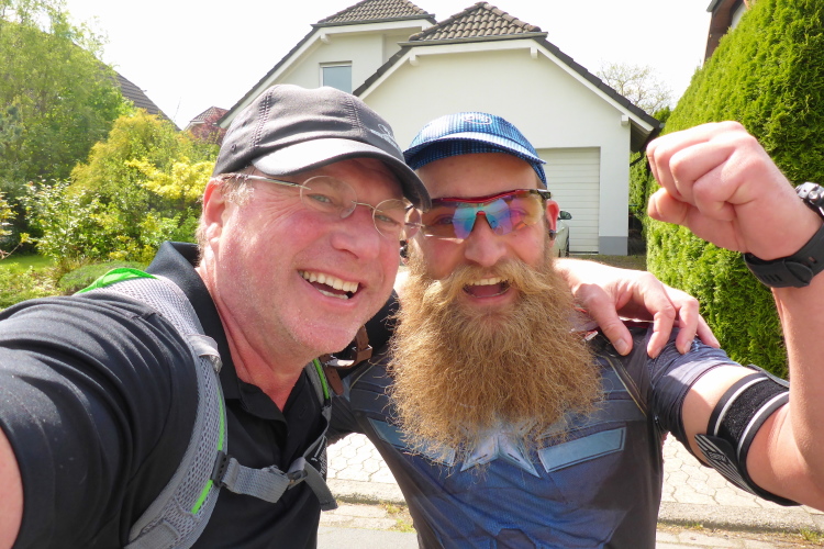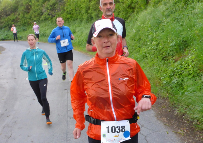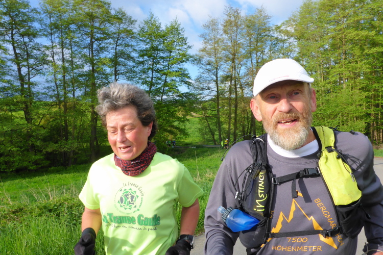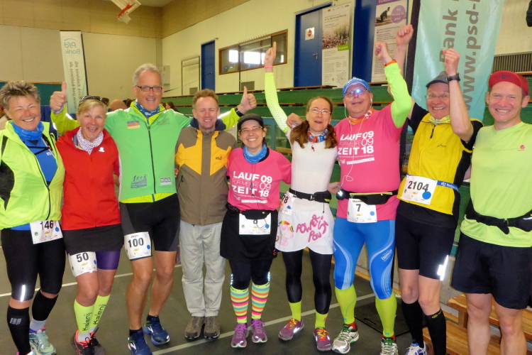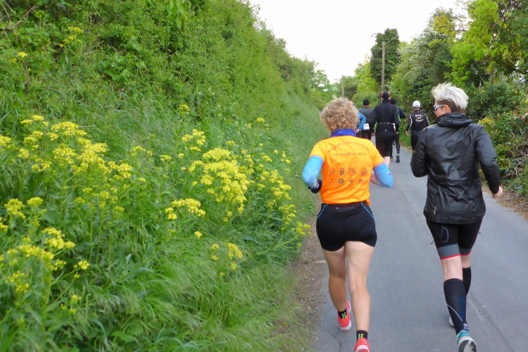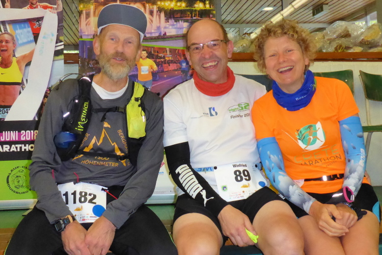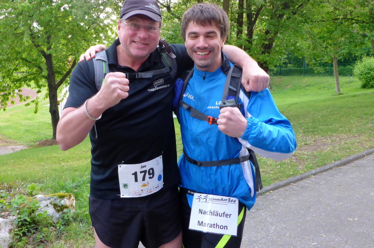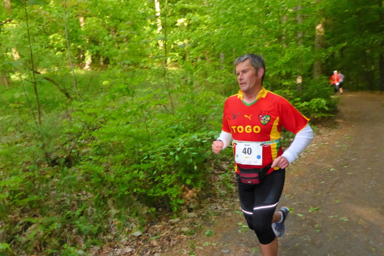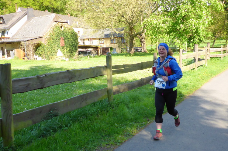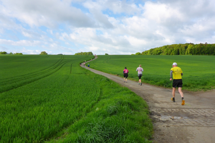 An der kleinen Bahnlinie ein lautes Hupen der Regionalbahn, hier gibt es einen unbewachten Bahnübergang. Den nehmen wir nicht, dafür ein kleines Trailstück geradeaus, wo wir auf die 5- Kilometerläufer und Teilnehmer des „Jedermannslaufes“ treffen. Ich finde es klasse, wie hier Leute animiert werden, die vorher noch nie gelaufen sind. Manche tragen Laufbekleidung, als sei noch tiefster Winter. Wenn ich die überhole, höre ich deren Raunen: „ Boah! Marathonläufer!“