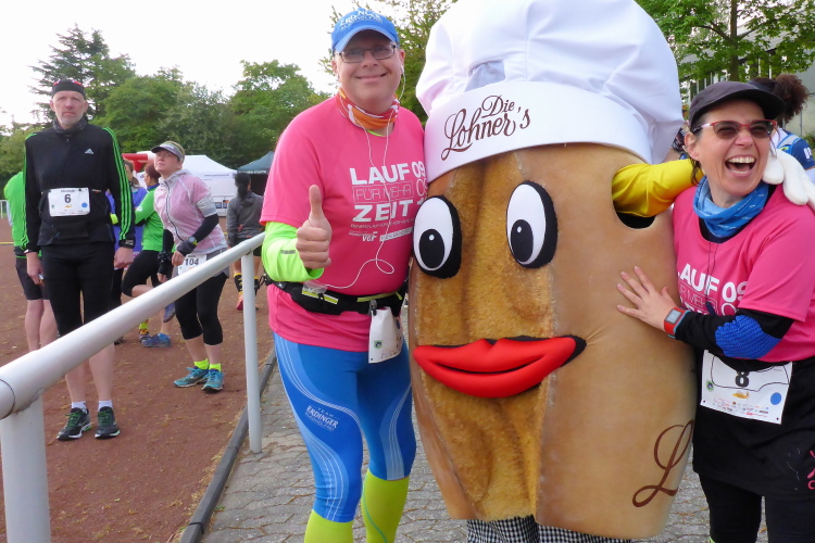 Lohni, das Maskottchen des Hauptsponsors, dient uns knapp 100 Marathonies zum Startposing, um 8 Uhr rennen wir los. Es werden 2 Runden, bestehend aus 2 Schleifen gelaufen, 900 Höhenmeter kommen so zusammen. Christoph, der Besenläufer, ist wie jedes Jahr knallhart: „ Joe, das Zeitlimit bestimme ich!“ Das ist so gemeint, dass er nicht diejenigen hetzen will, die am Samstag in Innsbruck, und/oder am Sonntag einen der Stadtmarathons gelaufen sind. Marathonsammler nennt man solche Spinner, die sich nun im hinteren Feld treffen, um zu beobachten, ob die schnellen Läufer alles richtig machen.