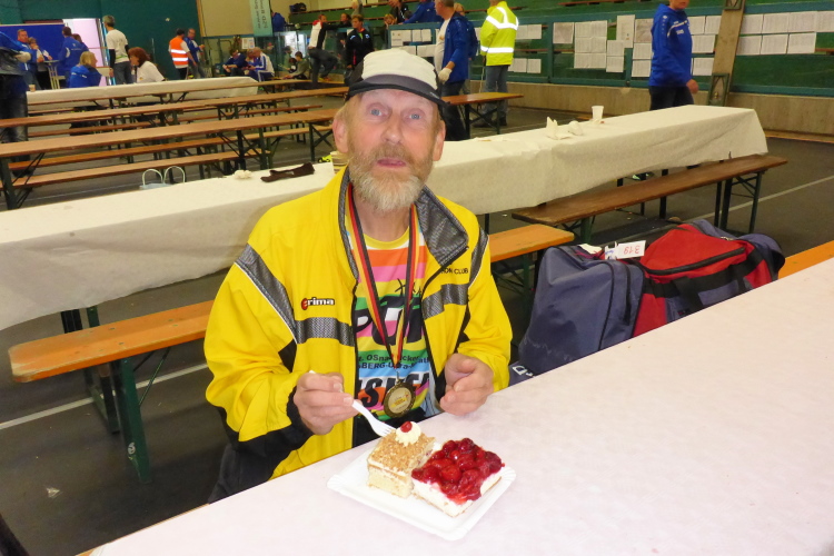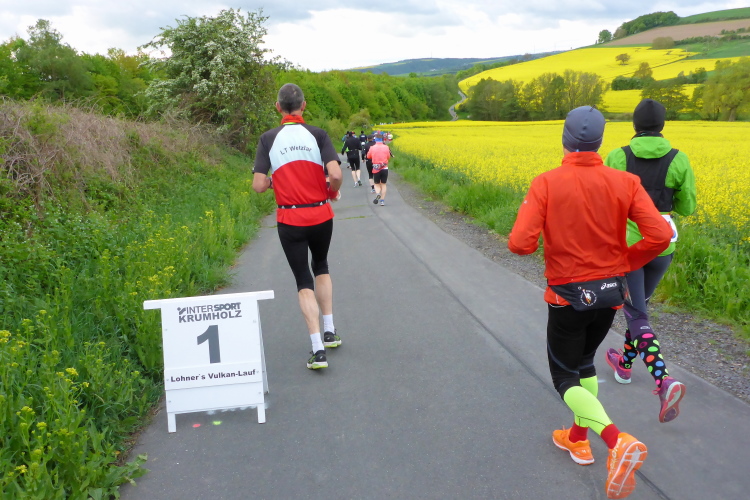 Dann biegen die ab und werden von den Halbmarathonläufern abgelöst, die mir rasend schnell entgegenlaufen. Als ich abbiege, um wieder hinauf zum Kraterrand zu laufen, überholt mich eine Walkerin: „1. Kuchen-Walker-Club“. Soll ich ihr hinterherrufen, dass ich am Sonntag 4:31 gelaufen bin?