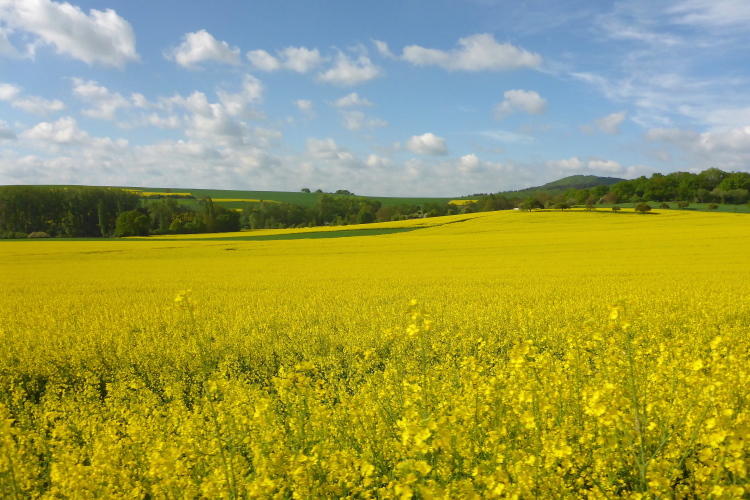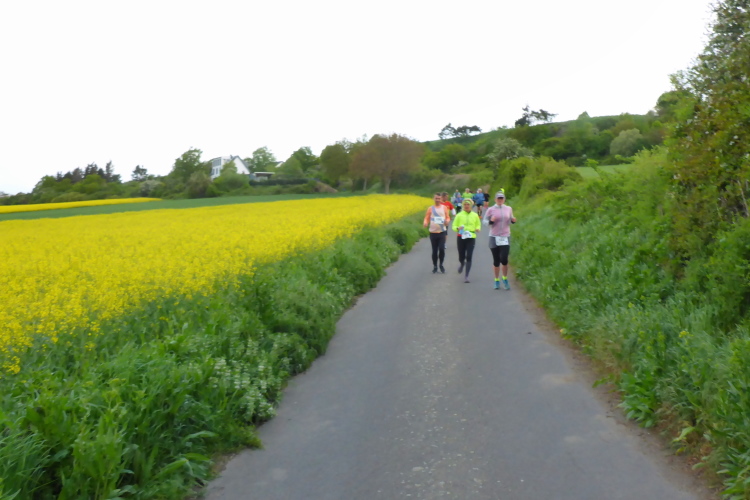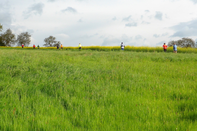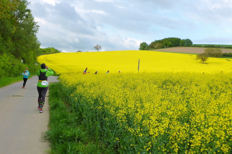 Die Stimmung ist hier so goldig, wie die Rapsfelder gelb. Und das soll so bleiben. Wenn ich die zahlreichen Stöckchenschwinger überhole, hören die den Aufprall meiner Hokas und springen panikartig zur Seite. Wer nicht hört, den wecke ich mit einem hämischen: „Macht ihr auch Sport?“ Dann springen auch die tänzerisch zur Seite und ich spitze die Ohren, bis ich es wieder höre: „ Boah, ey! Ein Marathonläufer“. Auch neugeborene Lämmer sind von mir begeistert. Zwei ältere Damen mit winzigem Hündchen ebenso: „ Wir laufen diese Strecke jeden Morgen!“