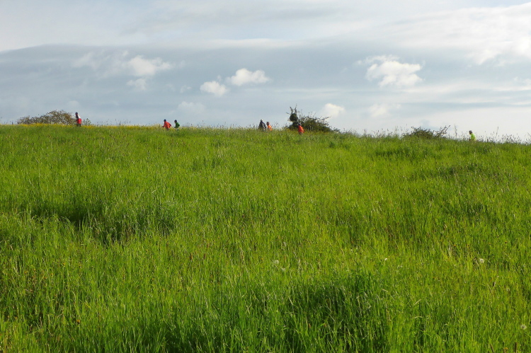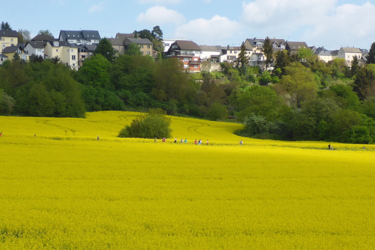 Alle machen alles richtig, denn ein Verlaufen in den Schleifen und an den Kreuzungspunkten der verschiedenen Strecken ist nicht möglich. Zahlreiche Helfer haben den Überblick. Wir auch, als wir oben am Kraterrand ankommen. Ungewöhnlich klar ist die Luft, weiße Wolken über dem sonnendurchfluteten Tele-Tubby-Land. Der Blick geht weit über den Rhein, bis hoch zum Westerwald.