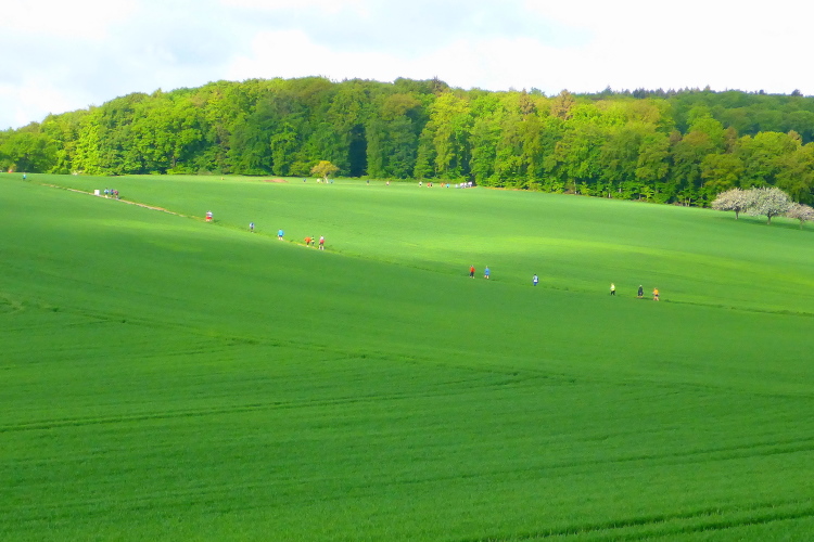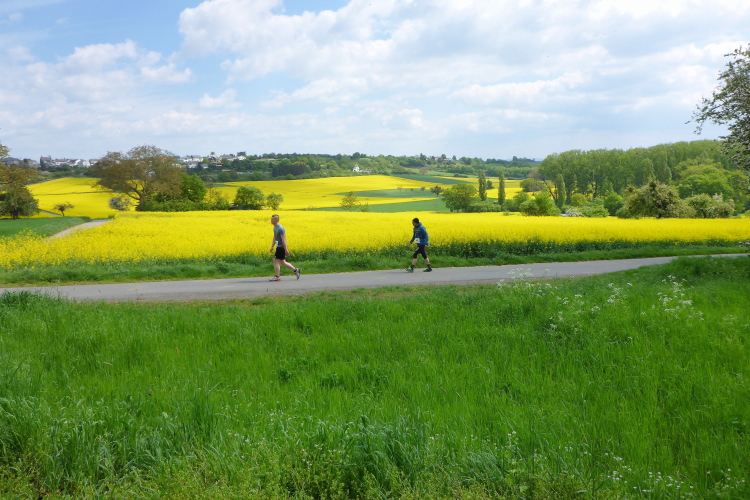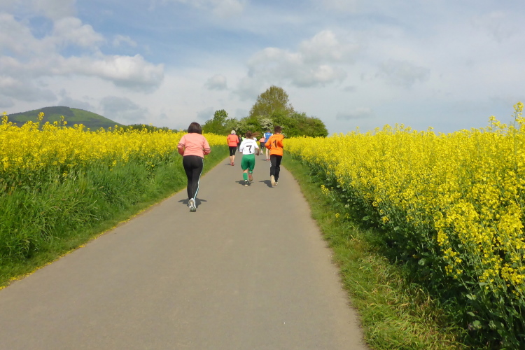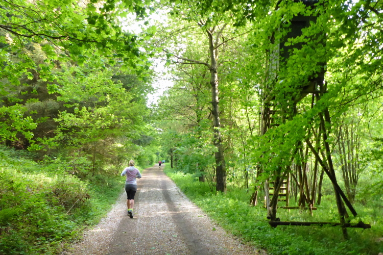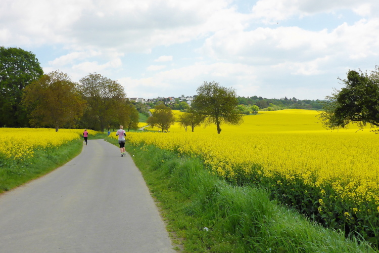 Das ständige Auf-Und-Ab der Strecke ist besser als jedes Intervalltraining. Viel Abwechslung zwischen Feldern, Wald und kleinen Häuseransammlungen. Im Stadtpark flüchten die brutbereiten Enten vor mir und beim „Aufstieg“ zur Erlenmühle flitzt mir eine Jungtruppe entgegen, um dann unten am Parkplatz erschöpft ins Auto zu kriechen. Alles läuft hier, alles rennt. Ich auch, weil es hier so viel Spaß macht.