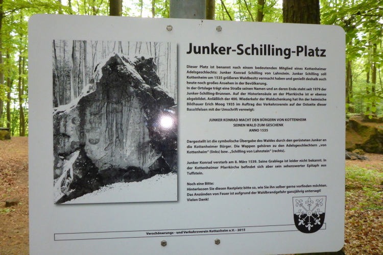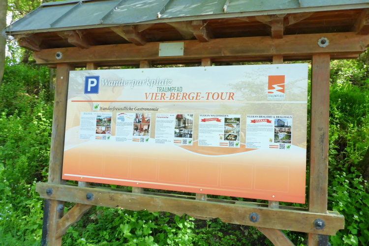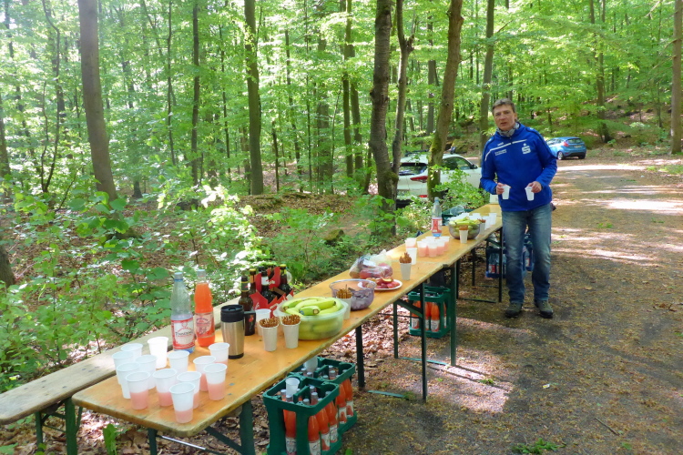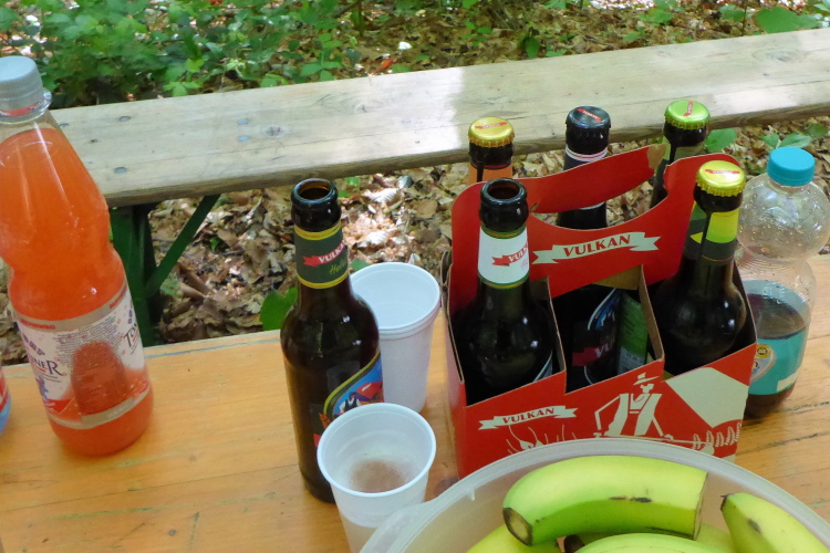 Die kleinen Buchenwälder sind saftig- grün. Das Herz freut sich, der Specht hämmert. Vögel zwitschern, Margit auch. Mee Too! Dieser VP wird von der Vulkanbrauerei bestückt und vom „Streckenradio“ beschallt. Schwungvoll geht es nun dem ehemaligen Bremsberg hinab. Einst wurden hier basaltgefüllte Lohren hinunter zur Bahnlinie Andernach-Mayen geschickt. Die leeren Lohren zog das Gewicht der vollen wieder hinauf. Das Basaltwerk ist kaum noch zu erkennen, nur noch die alten Mauern der Schmiede.