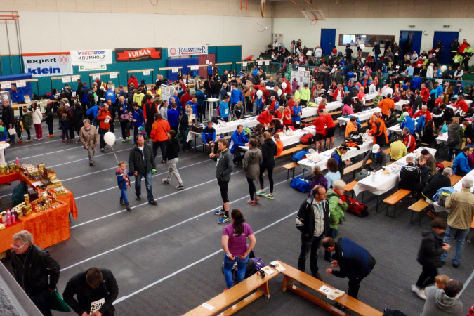 Camille, Robert und ich haben uns für den Halbmarathon entschieden, denn alle drei sind wir nicht recht fit und Camille hat sich sogar vom Halbmarathon auf den 10-Kilometer-Lauf umgemeldet. Doch als ich noch in der Sporthalle von den Umkleideräumen hinunterblicke, sehe ich sie plötzlich zur Startnummernausgabe eilen: Was ist los? Stimmt etwas mit ihrem Zeitmesschip für den Schuh nicht? Nein, es gibt eine hübschere Erklärung: Camille hat zwei andere junge Frauen getroffen, die den Halbmarathon absolvieren wollen. „Da kann ich doch nicht nur zehn Kilometer laufen!“ Das ist toll – eigentlich nicht fit, weil ihr Studium anstrengender ist als gedacht, hat sie sich jetzt doch für’s ganze Vergnügen entschieden. Denn der Halbmarathon besteht nach der ersten Runde am Hochstein noch aus einer zweiten Runde an einem niedrigeren Berg, so dass insgesamt gut je 400 Höhenmeter bergauf und bergab zusammenkommen.