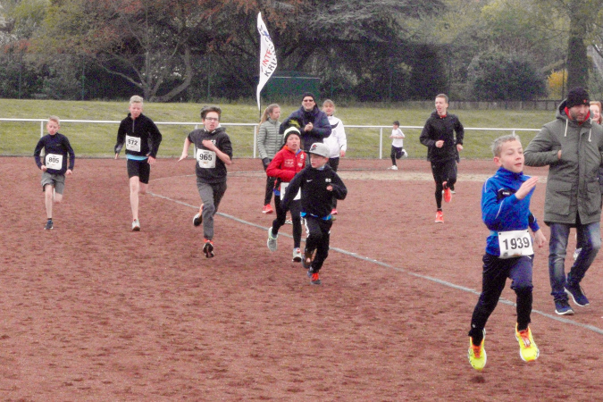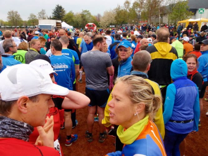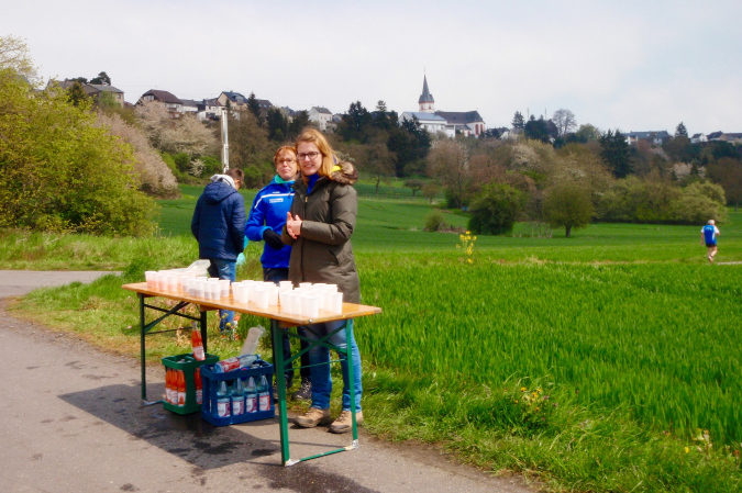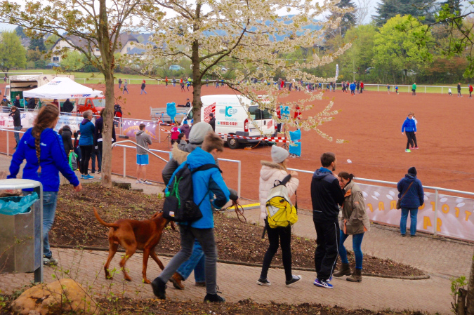 Als wir kurz nach halb zehn die angenehm warme Sporthalle verlassen, stehen wir sogleich zum zugigen Wind: Da ziehen wir uns gern noch einmal unter die Halle zurück, wo es für durstige Läufer auch schon vor dem Start Wasser zu trinken gibt. Das sei gleich hier deutlich gesagt. Der Vulkanlauf zeichnet sich nicht nur durch eine tolle Landschaft und sehr gute Organisation, sondern auch durch allerorten sehr freundliche Helferinnen und Helfer aus! Was man vom Eifelwind nicht behaupten kann. Aber nachdem die Kinderläufe geendet haben, füllt sich der Sportplatz trotzdem mit Läufern, die sich für den Halbmarathon und für den zehn Minuten später startenden 10-Kilometer-Lauf warmlaufen. Die Marathoni sind schon um acht Uhr gestartet. Wer von ihnen schnell unterwegs ist, kann also seine zweite Runde zusammen mit den Halbmarathonis absolvieren.