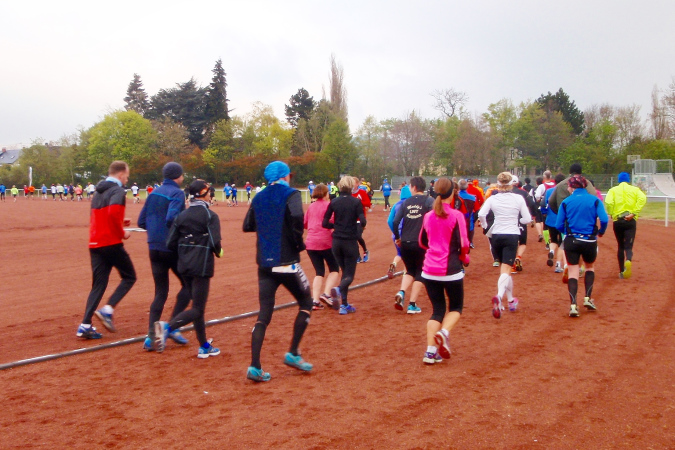 Auf dem Sportplatz haben wir uns warmgelaufen, soweit es bei dem kalten Wind geht. Eigentlich wäre es gut, sich besser aufzuwärmen, denn schon auf dem ersten Kilometer geht es ordentlich bergab. Der Start erfolgt durch einen recht engen Startkanal. Das führt zwar zu Gedränge vor der Startlinie, aber dank der Nettozeitmessung stört die Verzögerung nicht und man kann auf dem Sportplatz umso entspannter loslaufen. Der Sprecher erinnert noch einmal daran, dass heute der 1. Mai, also eigentlich Frühling ist – die meisten Läufer werden eher frieren.