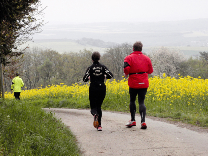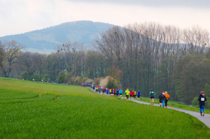 Schon vom Sportplatz aus geht der Blick hinauf in die Berge, die immerhin nicht mehr wolkenverhangen sind. Beim Verlassen des Sportplatzes wird es doch noch einmal eng, kurz geht es rechts auf die Straße und dann links den steilen Thürer Weg bergab. Kaum hat man den Ort verlassen, gibt es einen schönen Blick auf die Läuferschlange voraus; anders als im Vorjahr gibt es diesmal hier aber keine blühenden Rapsfelder. Die ersten Laufbilder zeigen es deutlich: Noch ist es verhangen, der Natur fehlt die Farbenpracht des Frühjahrs. Immerhin ist es trocken, was nach dem langen Dauerregen am Abend zuvor und in der Nacht doch ganz angenehm ist.