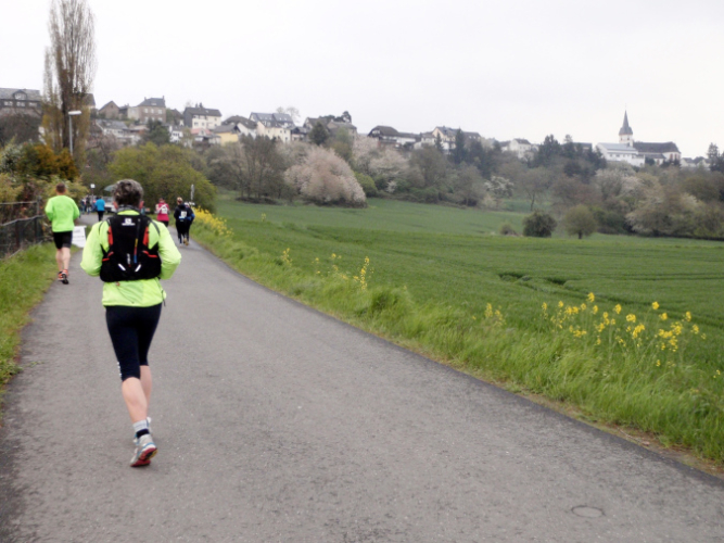 Dann folgt ein schöner langer Weg talab zu einer Eisenbahn. Längs von ihr geht es dann längere Zeit, einmal sogar über einen Grasweg, dahin. Überhaupt sind auch die befestigten Waldwege der Strecke in einem eher trailartigen Zustand; es sind nicht die langweiligen, breiten Forststraßen, die leider relativ häufig beim nahen Siebengebirgsmarathon zu belaufen sind. Das fördert, ähnlich wie die abwechslungsreiche Landschaft, ungemein die Attraktivität des Vulkanlaufs; er gleicht in dieser Hinsicht sehr dem Monschau-Marathon, der ebenfalls durch eine sehr abwechslungsreiche Eifellandschaft führt.