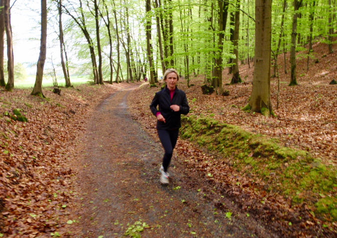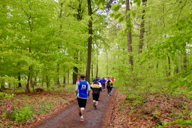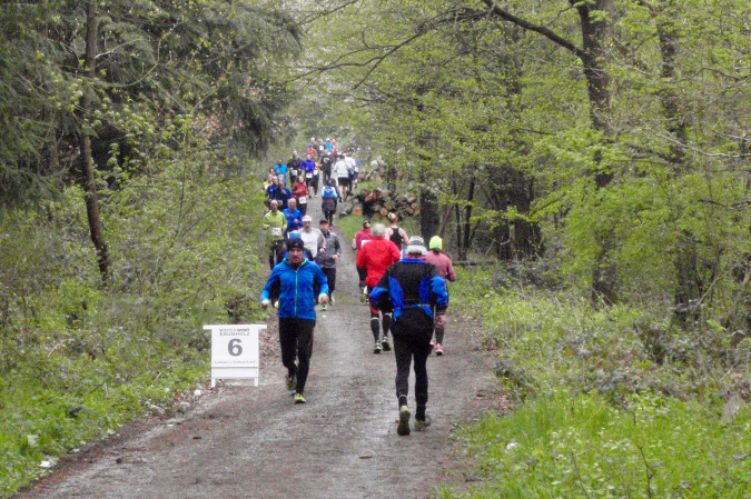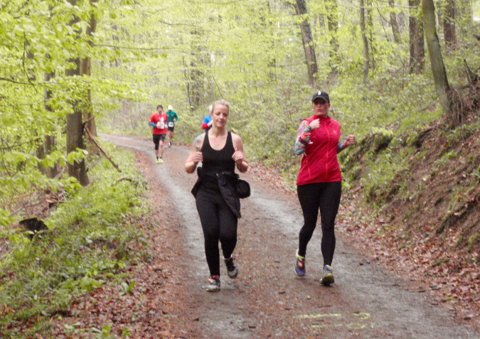 Während die Asphaltsträßchen von Anfang an abgetrocknet sind, sind die Waldwege später häufig recht nass, gelegentlich matschig und somit etwas schwerer als sonst zu belaufen. Besonders schön ist übrigens an den Laufstrecken des Vulkan-Marathons, dass man durch ein großes Gebiet läuft, das nicht von einer größeren Straße durchschnitten wird; nur zum Schluss läuft man erst ober-, dann unterhalb der gutausgebauten B 262.