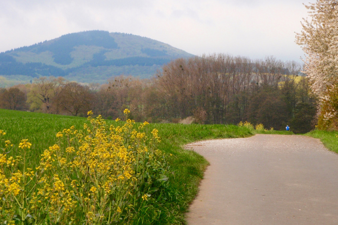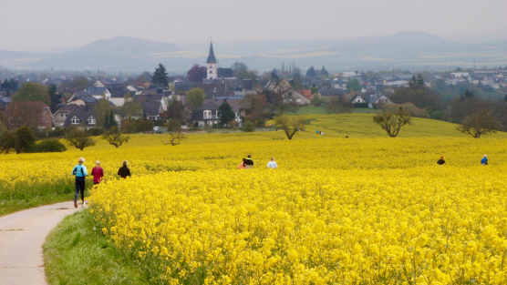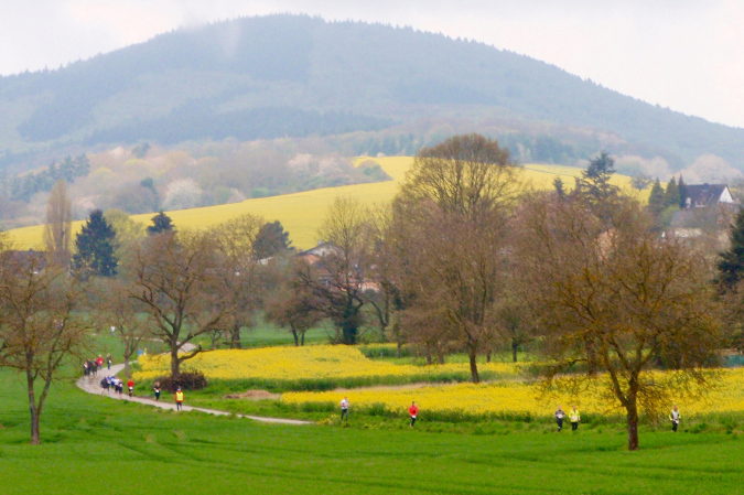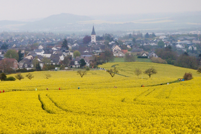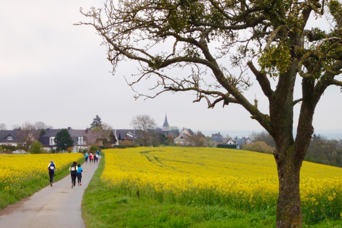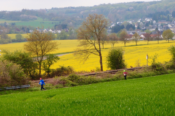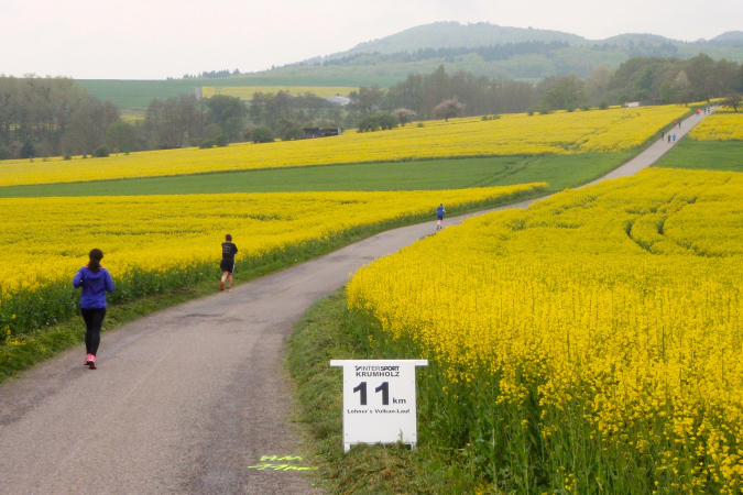 Beim Bergablaufen nach Obermendig beeindruckt mich freilich weniger der Vulkanismus, sondern dass die weiten Hänge in diesem Jahr in das leuchtende Gelb des blühenden Rapses getaucht sind: Interessant ist, dass überall dort, wo im vergangenen Jahr eher langweilig grünes Getreide oder Gras wuchs, jetzt der Raps blüht, und umgekehrt. Und plötzlich leuchtet der Raps sogar in einem Sonnenloch auf! Wir passieren nahe dem Ende des Gefälles wieder den Verpflegungspunkt bei km 3,4, laufen jetzt aber im Tal unterhalb des Kammes weiter, auf dem die Kirche von Obermendig thront. Links und rechts ist es jetzt überwiegend grün, während hier im letzten Jahr der Raps entzückte.