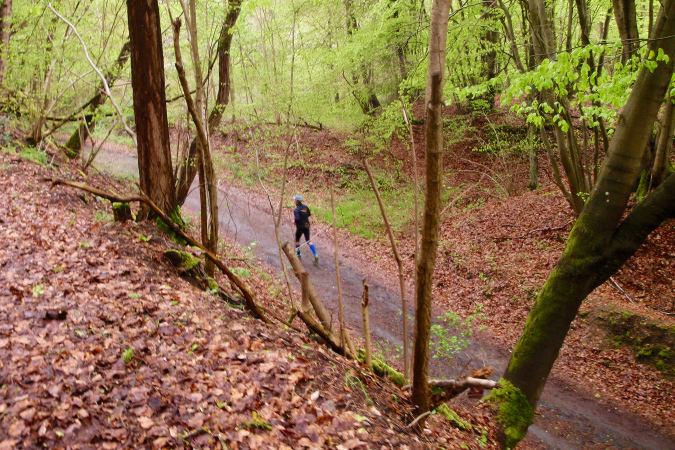 Im Wald ist das ganz angenehm und ich nehme die Steigung kaum wahr, empfinde sie eher als sehr human. Auch wenn mir die Kraft durch meine Erkältung fehlt – ausnahmsweise bin ich sogar mit Kopfschmerzen gestartet –, wird mein Kopf nach vier Kilometern frei und beginnt der Lauf richtig Spaß zu machen. Schon bald kommt der nächste Verpflegungspunkt kurz hinter einem eifeltypischen Steinkreuz in den Blick: Die 10-Kilometer-Läufer dürfen hier gleich den Abstieg unter die Füße nehmen, die Halbmarathonis erwartet hingegen anderthalb Kilometer Pendelstrecke durch den schönen Wald bis zum höchsten Punkt auf 445 Meter. Robert kommt mir schon bald entgegen, ein gutes Bild gelingt, aber Camille sehe ich zu spät – sie ist bisher noch gar nicht so weit vor mir.