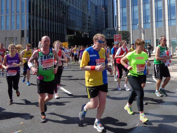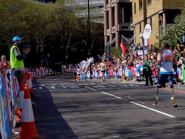 Ich bin nun am Nordufer angekommen und nicht mehr ganz frisch. Links der Tower von London. Die Sprints zwischen den Fotostopps haben Kraft gekostet. Als ich rechts einbiege, kommen mir Läufer entgegen, die etwa 9 Meilen vor mir sind. Viele sind es nicht. Da begegnet mir der eingangs erwähnte Richard Whitehead, wie ich gelesen habe, hat der im Vorjahr 40 Marathons binnen 40 Tagen auf seinen Prothesen absolviert. Übrigens ein sehr muskulöser Kerl.
