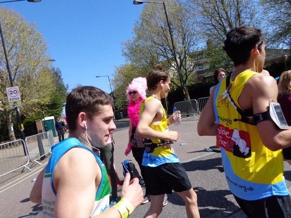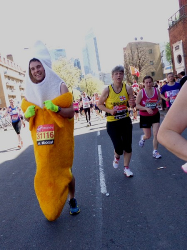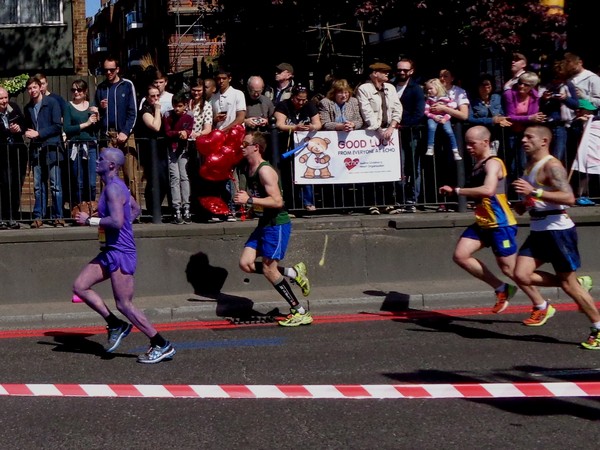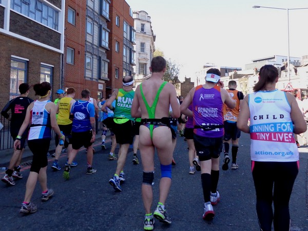 In der Canary Wharf „fliegt“ Superwoman an mir vorbei. Ab „West India“ geht es nach Westen, ziemlich direkt zum Ziel, das Herumkurven in den Docklands hat ein Ende. Meile 20, Kinder sitzen auf Leihrädern und klingeln wie wild, während ich eine Banane überhole. Vor mir läuft einer mit fast nichts am Körper. Nämlich nur mit so einem grellgrünen Stringzeug wie Sacha Baron Cohen im Film „Borat“. Der erregt ganz schön Aufsehen damit, das ist wohl auch der Zweck der Übung.