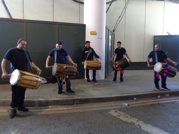 Obst kommt von den Zuschauern, vor allem Orangenschalen häufen sich am Boden. Zu den Orangen im Angebot: immer wieder Gummibären bzw. Wine Gums. In Schüsseln und auf Papptellern wird es uns angeboten. Viel davon liegt am Boden, die Übernahme scheint nicht ganz einfach zu sein. 6 Männer stehen an einem Gestell mit Glocken und läuten ausdauernd und synchron.