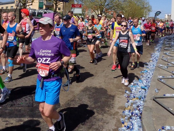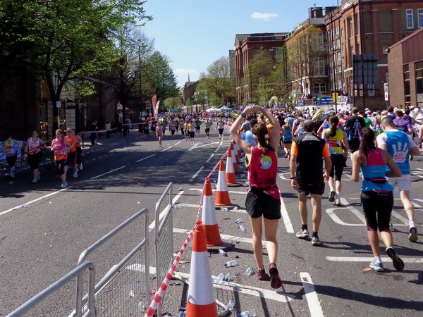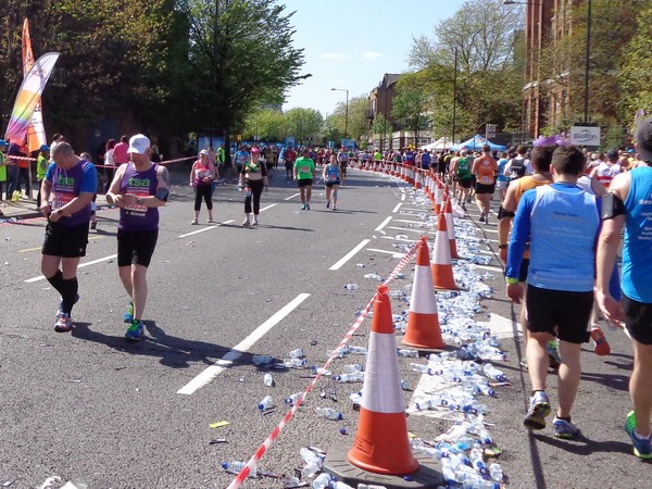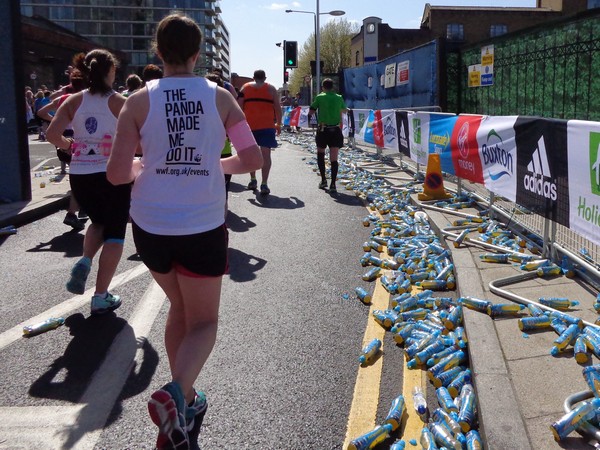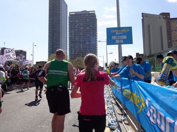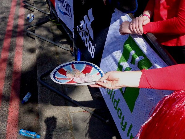 Meile 13 und bald Halbmarathon, ich brauche dringend etwas Nahrung mit Substanz. Noch eine Meilen bis zum CarboGel. Ganz schön sonnig ist es geworden. Gegenüber läuft einer völlig in lila.Vor der nächsten Labe kann man sich Vaseline geben lassen. „Fuel Station Ahead“, hier gibt es Lucozade. Alles, was der Sportler braucht. Darum gibt es auch keine Bananen, keine Äpfel, kein Salz, keine Kekse wie anderswo, sondern nur Wasser und Lucozade. Obst wäre für diese Anzahl an Sportlern frisch zugeschnitten wohl auch schwer bereit zu stellen.