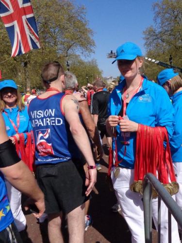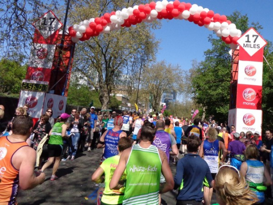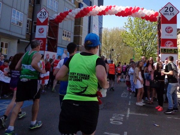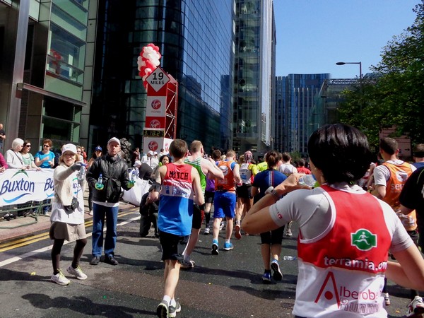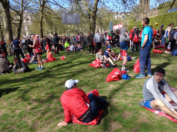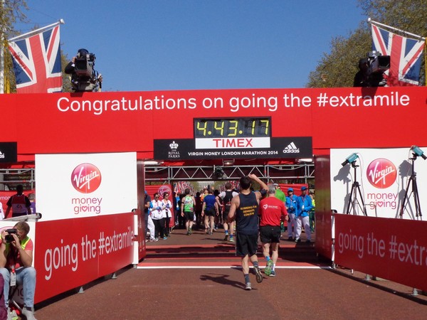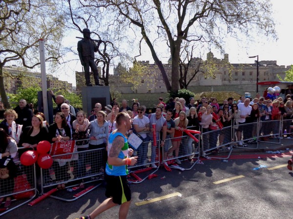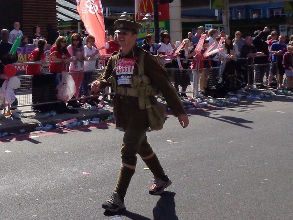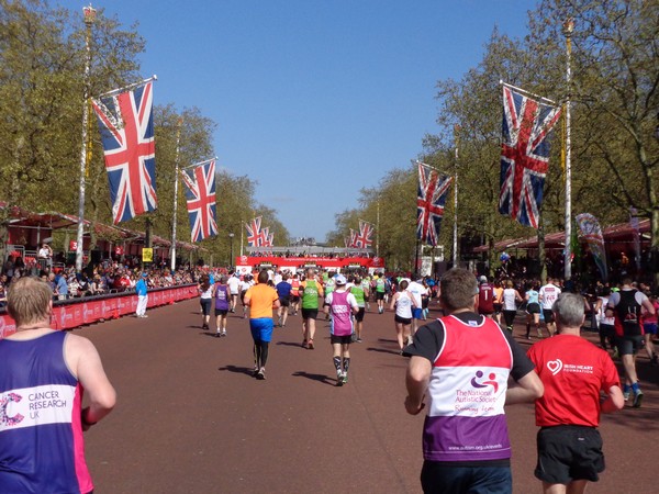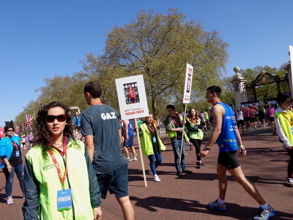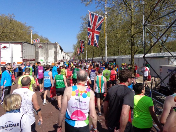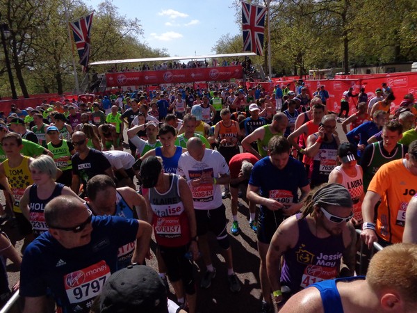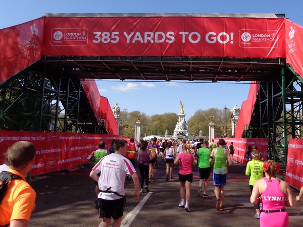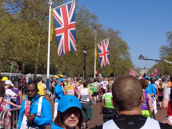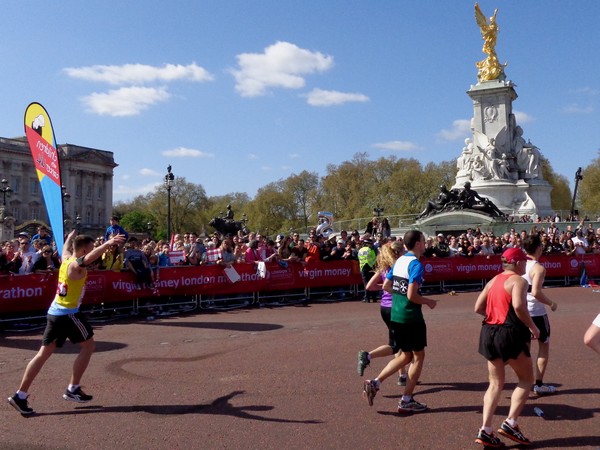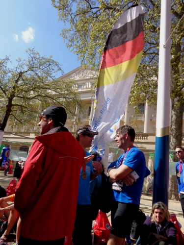 385 yards to go! Steht am provisorischen Fußgängerübergang, rechts eine jubelnde Menschenmenge, links am Victoria Memorial ebenfalls. Den Buckingham Palace im Rücken, noch 200m, The Mall vor mir. Eine junge Dame kommt in vollem Lauf daher und klatscht dem Borat-Wiedergänger mit der flachen Hand auf den nackten Hintern. Der ist zu erstaunt, um reagieren zu können. Links außen sehen 3 Soldaten dem Treiben zu, die schönen Tulpen beachten sie nicht. Nur mehr wenige Meter bis ins Ziel, nach 4h39min bin ich da und habe über 14.000 Läufer hinter mir gelassen. So viele wie selten zuvor. Kurz nach mir ist auch Norbert im Ziel. Einige Fotos von Neuankömmlingen zu schießen wird mir verwehrt. Bitte weiter gehen, nicht stehen bleiben! Ständig kommen neue Finisher ins Ziel.