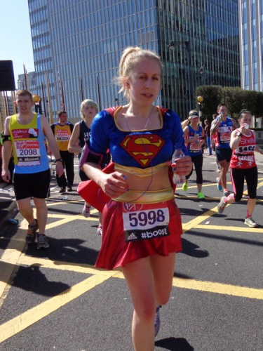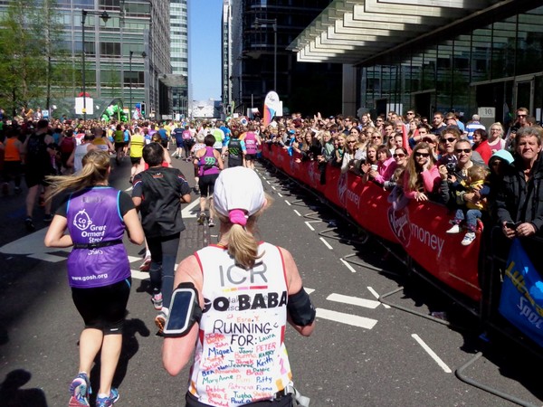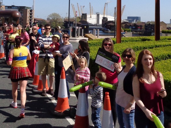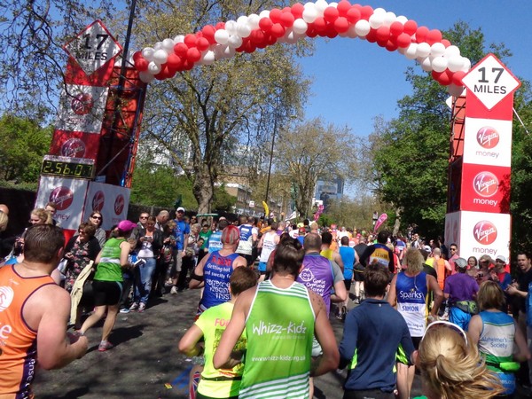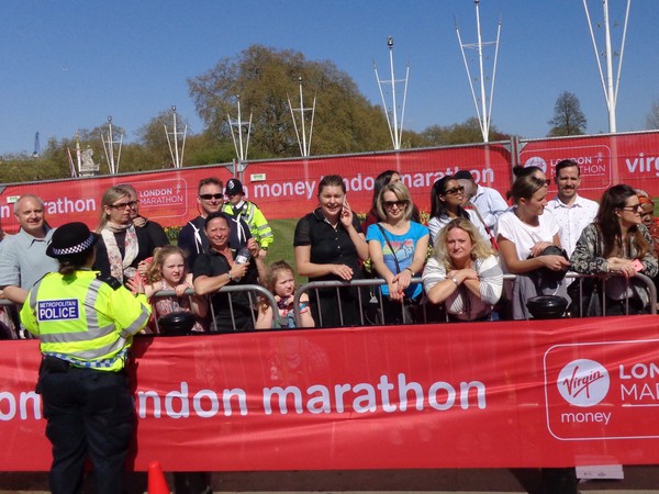 Wir kommen aus dem Tunnel raus und laufen unter der Blackfriars Bridge durch. Hier werden Passanten über die Marathonstrecke geschleust. Eine Straßenhälfte wird gesperrt, die Zuseher können auf eine Verkehrsinsel in Straßenmitte. Wenn die gefüllt ist, werden wir Läufer auf die andere Straßenhälfte gelotst, und die Leute können auf die andere Straßenseite rüber. Das scheint gut zu funktionieren. Nun geht es eine Weile am linken Ufer der Themse entlang in Richtung Parlament. Das Riesenrad „London Eye“ kommt immer besser ins Blickfeld. Gestern sind Evi und ich eine Runde damit gefahren, der Überblick von da oben ist wirklich ausgezeichnet. 135m ist es hoch, pro Glasgondel lässt man 25 Leute rein, die haben locker Platz da drinnen. Bei Eröffnung 1999 war es das größte Riesenrad der Welt, das größte Europas ist es immer noch. Da sehe ich Superwoman Lisa wieder. Sie ist es etwas zu schnell angegangen.
