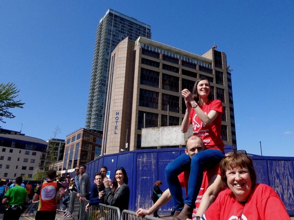 Ab dem Tower Hill ist wieder richtig viel los. Unbeschreiblich, was hier abgeht. Vorhin hätte ich ganz gern einmal ein paar Minuten Ruhe gehabt, jetzt kann ich die Action am Straßenrand wieder richtig genießen. Beim Monument, Meile 23, ist der Akku der Kamera leer, ich bleibe am Rand stehen, um einen Reserveakku hervor zu kramen. Mit sorgenvoller Miene werde ich gefragt, ob es mir denn gut gehe und ob sie mir helfen könne? Als ich ihr das Problem erkläre, ist sie richtig erleichtert. Ich bekomme noch die besten Wünsche der Umstehenden mit auf den Weg und setze mich wieder in Bewegung.