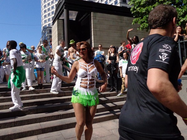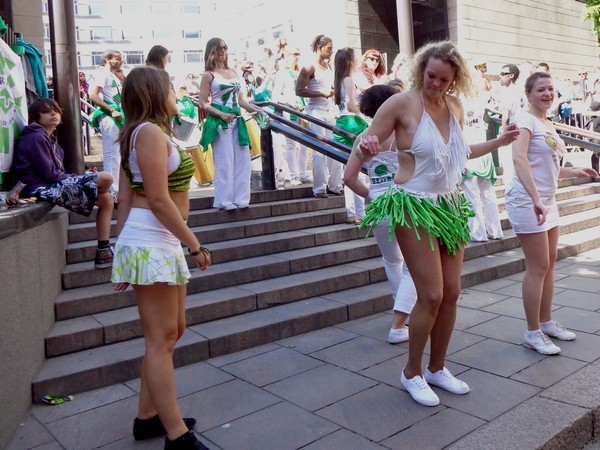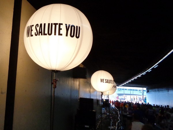 Die Duschen an der Strecke werden im Vorhinein angekündigt, so kann ich problemlos rechtzeitig ausweichen. Ein Teil meiner Kräfte ist zurück gekehrt, ich bin aber für jedes Fotomotiv dankbar, ob das nun Dutzende Trommler sind, ein ganzes Blasmusikorchester oder Tänzerinnen in zu engen Kostümen. Wolkenkratzer wie in Manhattan oder Philadelphia hat man hier aus dem Boden gestampft. Scheinbar hochwichtig, denn wir laufen durch Straßen, die im Normalfall mit Schranken abgesperrt sind. Jeder darf da nicht rein.