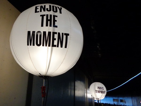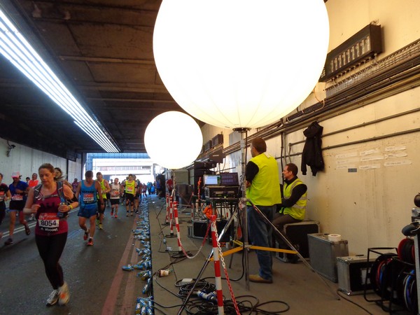 Es geht die Upper Thames Street runter und flach dahin. Hier ist es kühl, wir sind nun ganz in der Nähe der St. Paul’s Cathedral, können sie aber nicht sehen. Erst ist die Kirche von Häusern verdeckt, dann laufen wir in eine Straßeneinhausung. Super Musik da unten, mangels Zuseher, werden wir von leuchtenden Ballons angefeuert. Die Millennium Bridge wäre auch da oben, eine Fußgängerbrücke, im Juni 2000 eröffnet, 325m lang.