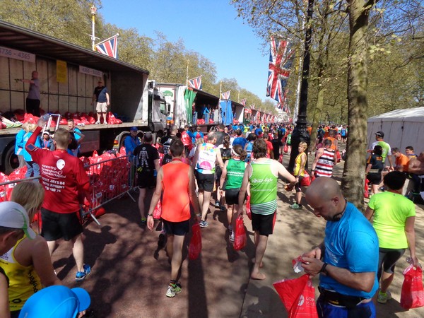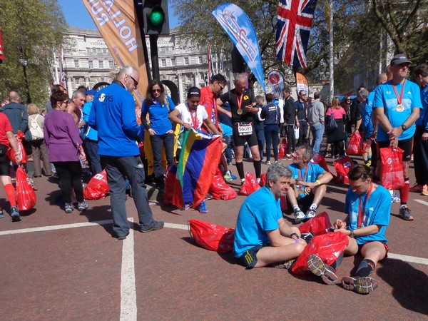 Beim Chip-Abzwicken staut es, über die ganze Front des 3-torigen Zieleinlaufs ist eine Rampe gebaut, da müssen wir rauf. Unten sitzen Helfer und zwicken den Chip ab, erst dann gibt es die gewichtige Finisher-Medaille. Weiter The Mall Richtung Trafalgar Square zu den LKWs mit den Kleiderbeuteln. 4 Helfer stehen auf jedem Sattelauflieger, je 4 davor. Die oben spähen aus, wer da kommt, die unten drücken einem seinen Beutel mit einem „Congratulations“ in die Hand, bevor man noch ein Wort gesagt hat. Das geht ganz zügig.