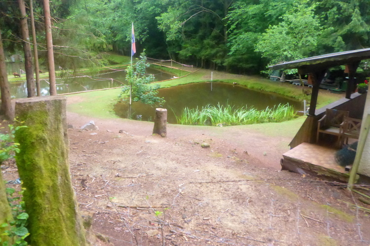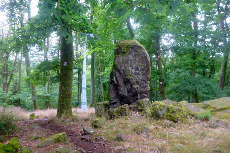 Dann wird es wieder angenehm. Auf breitem Weg erreichen wir den kleinen Bärenfelsweiher. Am Brunnen versuche ich nochmal den Kopf zu kühlen. Die Kollegen von der Feuerwehr helfen über die Eichenwaldstraße zu unserem nächsten Felsenglück, dem Adelsfelsen. In schneller Folge erreichen wir die Ruine der Römerburg und eine weitere vermutliche Mittelalterliche Burgruine. Leider sind von beiden nur noch die Moosbewachsenen Grundmauern übrig. Ingo entpuppt sich als kompetenter Reiseleiter. Er kennt sich aus und weist immer wieder auf Kleinigkeiten, die ich sonst übersehen hätte.