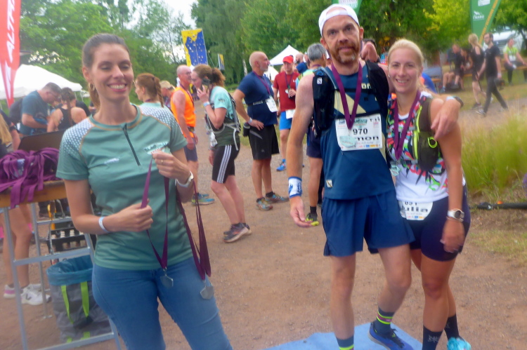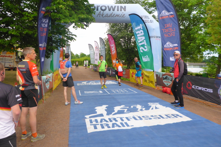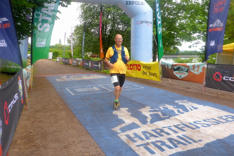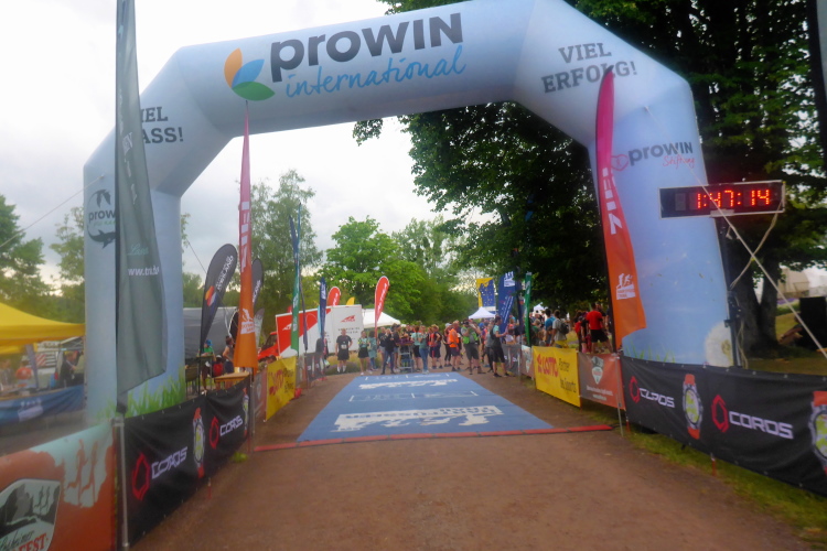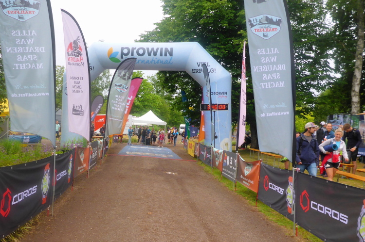 Jetzt geht es eigentlich nur noch bergab, unten im Tal überhole ich Thomas nun wieder. Etwas wehmütig jogge ich dem Ziel entgegen, schade dass es zu Ende ist. Norbert erwartet mich, er konnte dank Livetracking meine ungefähre Zielzeit ermitteln. Wir erleben noch die Siegerehrung des T 23 und der beiden Kombiwettbewerbe. Jeder Finisher der Kombis bekommt ein hochwertiges Handtuch.