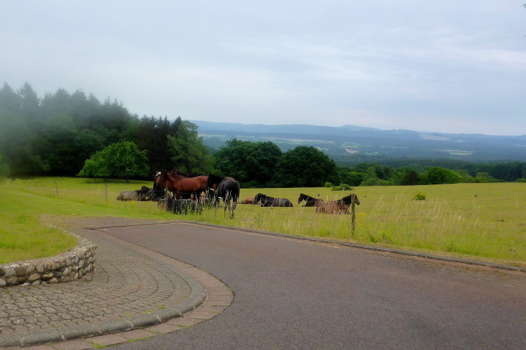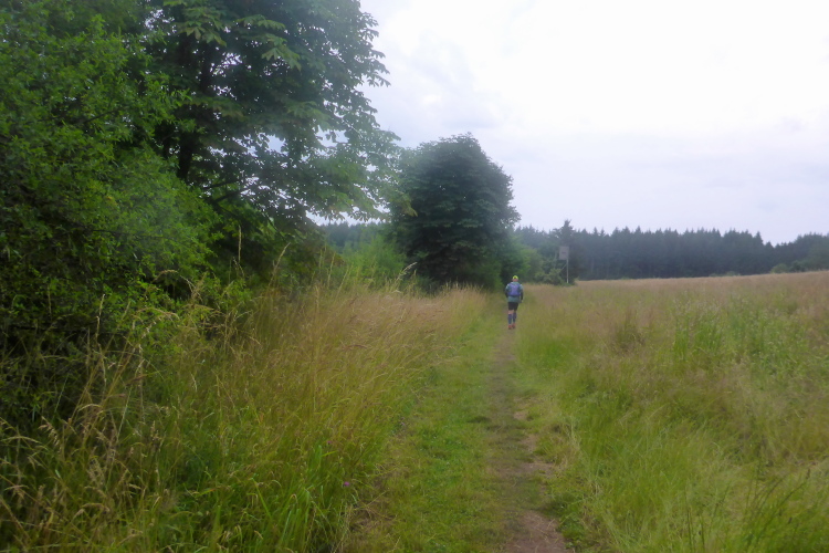 Hinter km 4 kommt es zur Streckentrennung. Hier durften wir Gestern direkt nach Scheiden, heute führt der Weg rechts. Wir laufen an einer großen Pferdeweide vorbei, im Wald bergauf, über ein Sträßchen und dann von hölzernen Weidezäunen begrenzt wieder bergab. Mittlerweile hat sich eine kleinen Gruppe zusammengefunden: Norbert und ich, Diane und Louis aus Luxemburg, Ursula und Ingo die Schlussläufer.