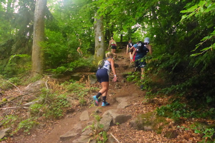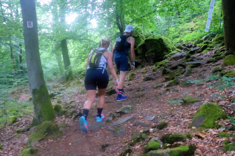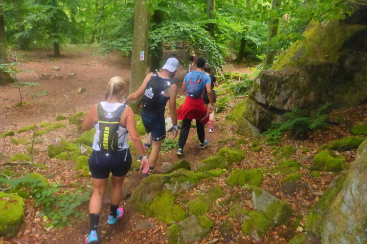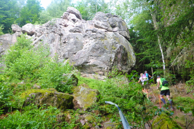 Erster Höhepunkt auf der „Traumschleife Felsenweg“ ist der „Teufelsfels“, ein ca 5 m hoher Felsblock, der umklettert werden muss. Hinter einer Biegung hat sich der Fotograf postiert. Ich hatte mir an der VP Wasser über den Kopf gegossen und sehe sicher nicht sehr fotogen aus. Da muss ich jetzt durch.