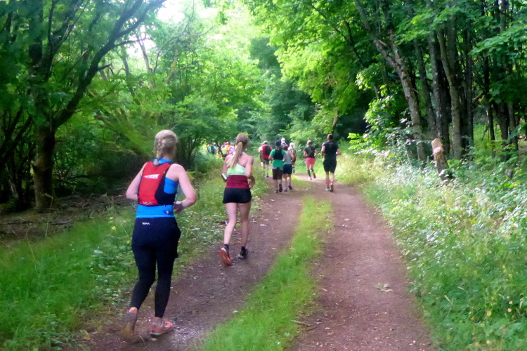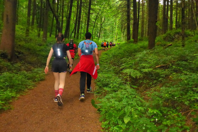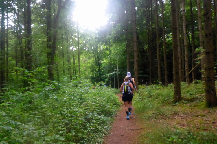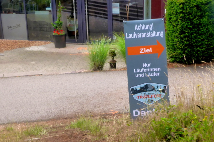 Norbert hält sich hinten, er hat immer noch Schmerzen in der Wade; ich will mal ausprobieren, was geht und reihe mich ins Mittelfeld. Wir verlassen das Eventgelände steil bergauf. Oben biegen wir auf den Radweg an der kleinen Zufahrtsstraße entlang, dann links auf einen Feldweg am Waldrand. Man bleibt hintereinander, damit keiner ins hohe Gras muss. Scharf rechts führt ein Trampelpfad in den Wald. Im Zick Zack sausen wir auf dem weichen Waldboden dahin. Vom Lauf überraschte Spaziergänger applaudieren für jeden Läufer. Mich motiviert das ungemein.