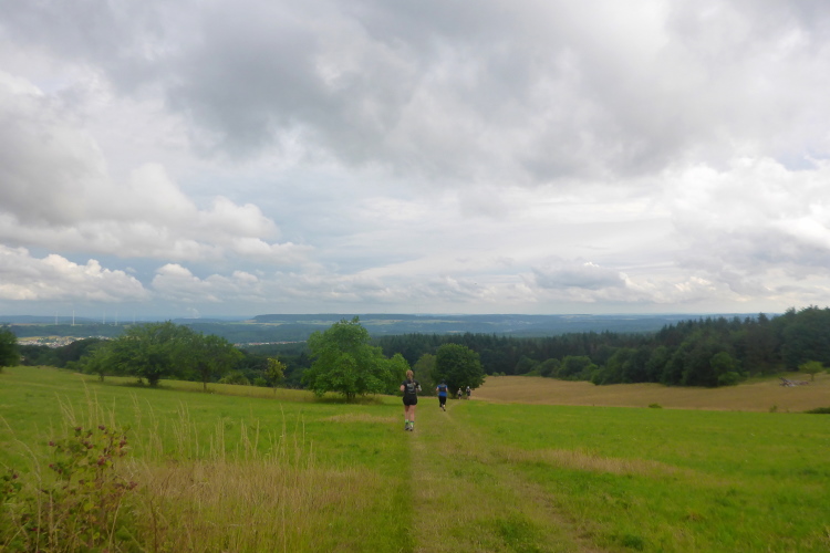 Wir verlassen den Wald. Wieder auf dem Feldweg wird die Läuferschlange langsam lichter. Mein Puls überschlägt sich bereits, im nehme etwas Tempo raus. Am Waldrand bietet sich grandioser Weitblick, dafür gebe ich Gas beim perfekten Downhill.