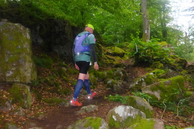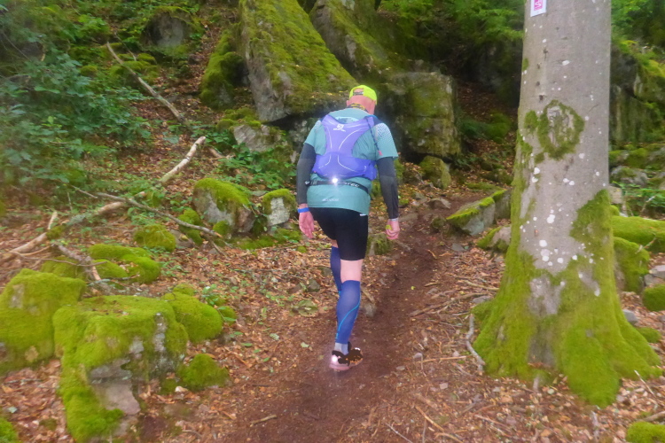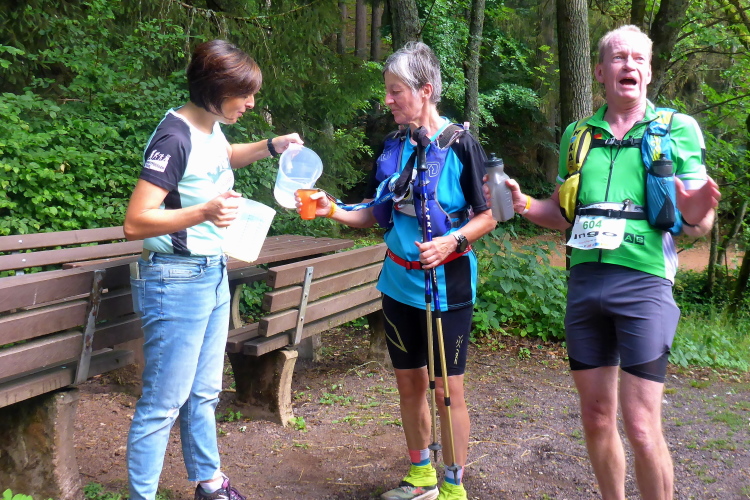 An der ersten VP am Backhaus in Waldhölzbach halte ich für einen Becher Wasser und ein Schwätzchen mit den Helfern. Der Fotograf steht diesmal am schwierigen Abstieg vom Teufelsfels. „Ich wollte mal was anderes sehen,“ meint er.