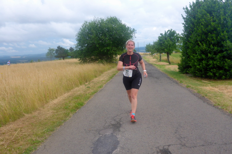 Im Wald drehen wir eine Schleife auf der Heisborner Höhe über Britten. Während der nächsten 2 Kilometer verliere wir 150 Hm das letzte Stück in der prallen Sonne. Ich hab das Gefühl, mein Gehirn beginnt zu schmelzen. Ich will nur, dass das bald zu Ende ist. Ursula vor mir scheint es ähnlich zu gehen. Die Männer haben wir irgendwo verloren. Ich bin am Limit.