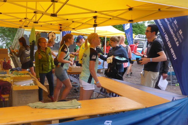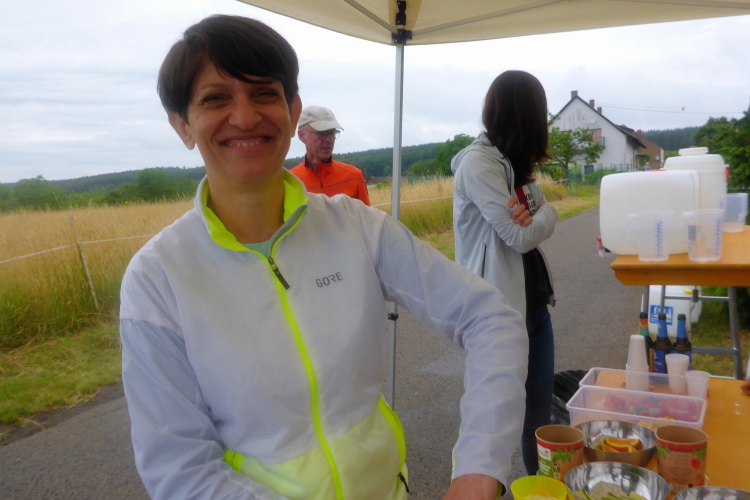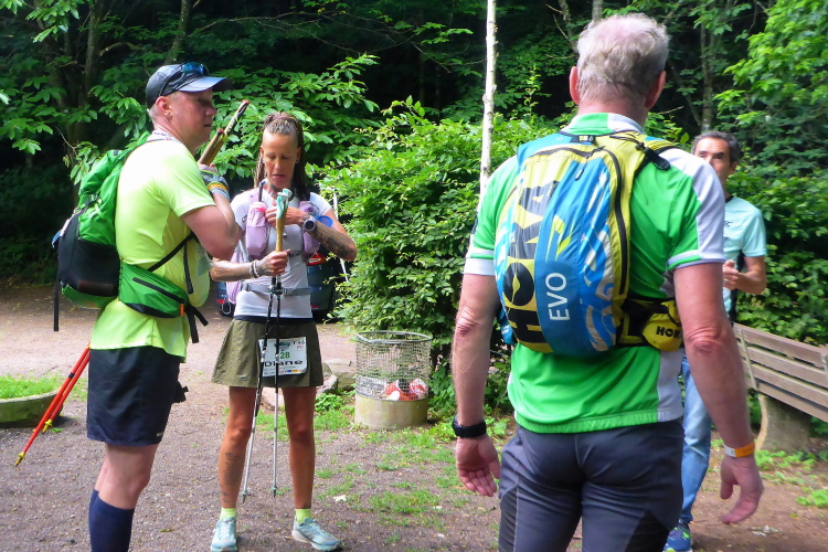 Trotzdem können wir das Angebot an der VP nicht richtig genießen. Hier herrscht eine Invasion von Mücken, denen wir nur mit Mühe entgehen. Unser Mitleid gilt den Helfern, die nicht einfach abhauen können. Hier treffen wir auf einen Läufer des T 75. Er sieht mitgenommen aus. Die Hitze scheint auf der 77 km langen Strecke mit knappen 2.700 Hm ein größeres Problem zu sein.