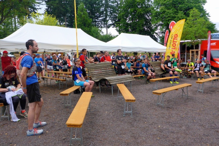 Heute lassen wir es ruhig angehen. Start um 10 Uhr ist komfortabel. Ich habe Muskelkater, aber lange nicht so schlimm wie beim Pfälzer Berglandtrail. Norberts Wadenbeschwerden sind schlimmer geworden. Er überlegt, ob er überhaupt starten soll. Leichtes Joggen zum Start bringt Gewissheit: Es hat keinen Sinn, er bleibt hier. Auch Louis, unser Begleiter von gestern, meldet sich ab.