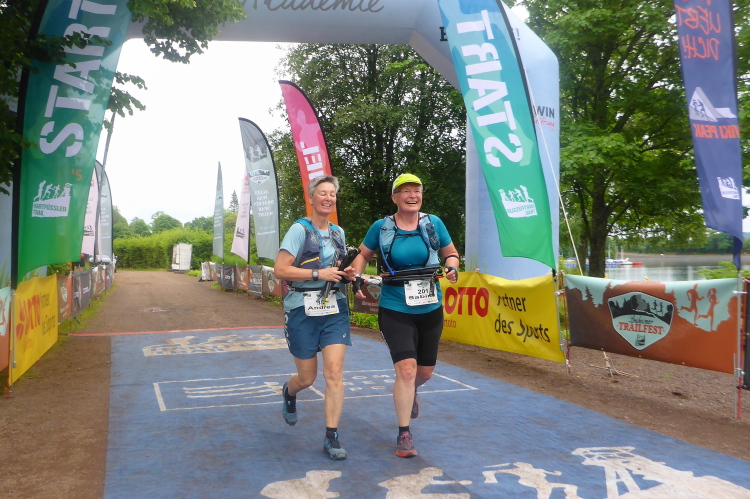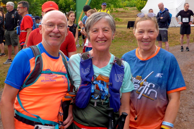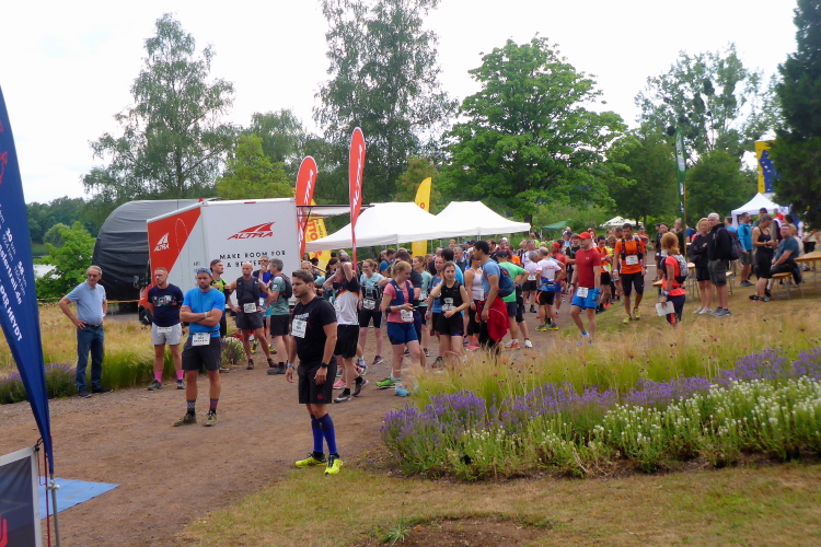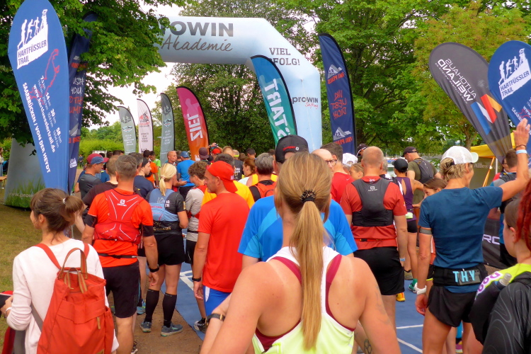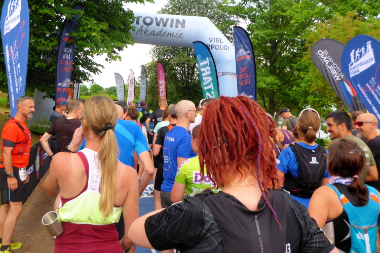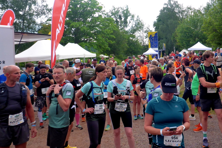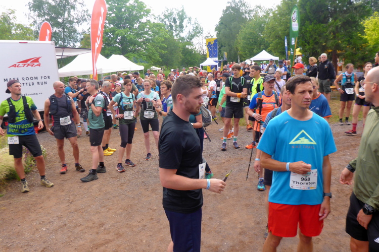 Am nächsten Morgen sind wir schon um 6 Uhr wach, so dass wir vom Hotel aus den Läufern des langen T75 nachschauen können. Der Start des T 43 ist um 9 Uhr. Wir checken noch die Pflichtausrüstung, wie Handy und Wasservorrat, dann begeben wir uns zum Eventgelände. Wegen des gestrigen Gewitters ist die Luft klar und frisch, der Wetterbericht verspricht Höchsttemperaturen von 24 Grad bei meist bewölktem Himmel. Das werden optimale Laufbedingungen.