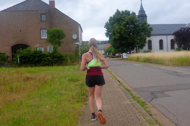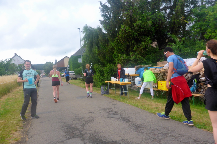 Wir erreichen eine Straße, über mir liegen die Häuser von Scheiden. Der Ort scheint ausgestorben, die gepflegten Straßen sind verwaist. Am höchsten Punkt erreichen wir die Verpflegungsstelle bei km 7,5. Die Helfer bieten Wasser und ISO. Ich habe einen eigenen Wasservorrat, und verzichte dankend. Die Luft hier oben ist frisch, ich atme richtig durch und kann ein paar Plätze gutmachen.