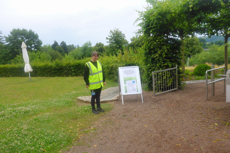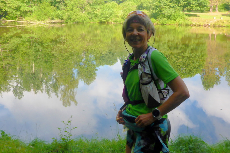Wir sind zügig unterwegs, freuen uns über die schönen Trails und tauschen so manche Lauferfahrungen. Zwei Teiche des örtlichen Angelvereins liegen beschaulich in der Sonne, der Barfußpark lädt zum Erkunden ein. Bald liegt Waldhölzbach über uns. Die Ortsstraße führt steil bergauf, Feuerwehrmänner sichern die Straße. Hinter der Kirche geht es gleich wieder auf steilen Trail, an dem versteckt liegenden Eingang der Mariengrotte vorbei.