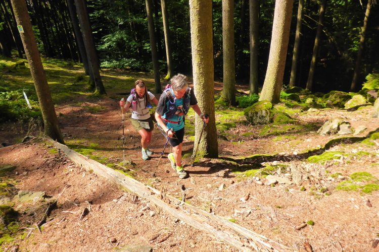 Bergauf unterstützen mich meine Stöcke, ich kann aber nicht verhindern, dass eine ganze Gruppe Läufer an mir vorbei stapft. Auch Norbert ist hier dabei. Scharf links, der Wald wird licht, es geht nun steil bergab. Mein Blick bleibt eisern am unebenen Boden. Auf keinen Fall will ich mich hier hinlegen.