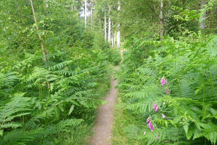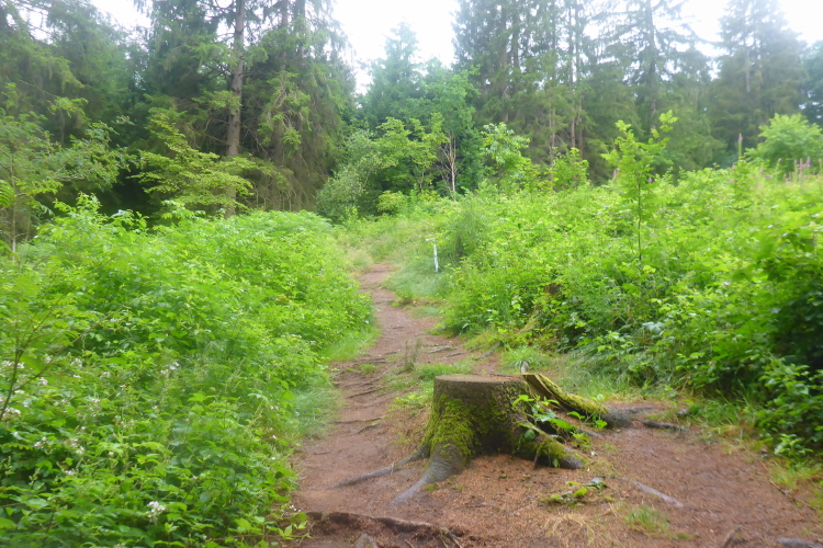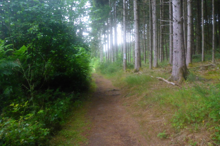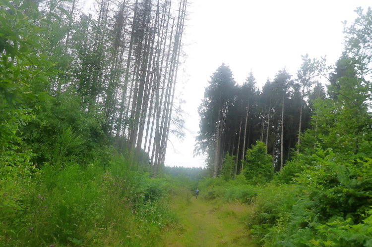 Der ominöse „letzte Anstieg 5 km vor dem Ziel“ ist ein breiter Waldweg mit hohem Bewuchs. Jeder sucht den besten Weg für sich. Weil es nicht brutal steil ist finde ich das gar nicht schlimm. Oben angekommen wird der Weg besser. Ich rolle hinter Ursula her ein bequemes Gefälle hinunter, die Männer halten sich hinten.