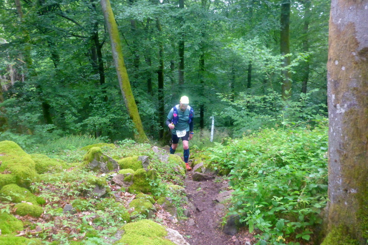 Vor dem Schlangenfels überholt mich Thomas. Wir wechseln ein paar Worte. Auf dem Anstieg nach Scheiden fängt es zu regnen an, bei diesen Temperaturen ist das gerade noch angenehm. An der VP gibt es einiges an Süßzeug, Obst und Salzbrezeln. Aufs Bier verzichte ich heute, irgendwie hab ich das nicht verdient. Cola ist mehr als genug.