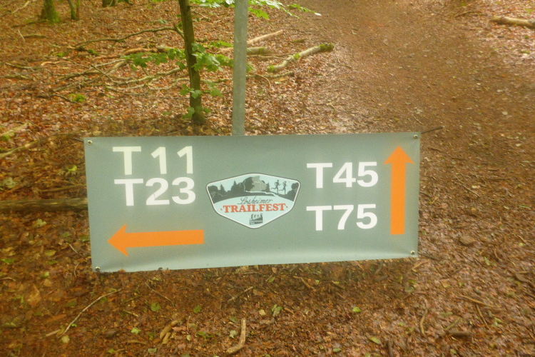 Bevor die Richtungspfeile auf schmalen Trail zweigen kann ich ein paar Läufer überholen. Das passt ganz gut, denn nun geht es steil bergab. Aufmerksam halte ich Blickkontakt mit dem Boden, so erkenne ich rechtzeitig den scharfen Abzweig hinunter zu einem schmalen Holzsteg. Auf der anderen Seite wartet ein großes Schild, das die Weiche auf die verschiedenen Trailstrecken der drei Tage Trailfest anzeigt. Für den T11 müssen wir links.