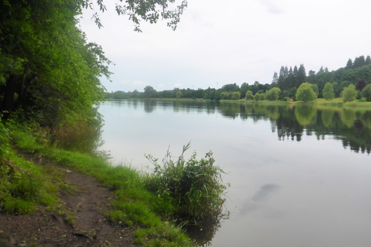 Es geht auf schmalen Pfad, der Wald wird düster. Kurvig und flach schlängelt sich der Weg zuerst am Losheimer Bach, ein kurzes Stück auf Asphalt und dann am Seeufer entlang. Langsam geht mir die Puste aus und ich muss Tempo raus nehmen. Außerdem ist es teilweise steinig und wurzelig – konzentriertes Füße heben bleibt notwendig.