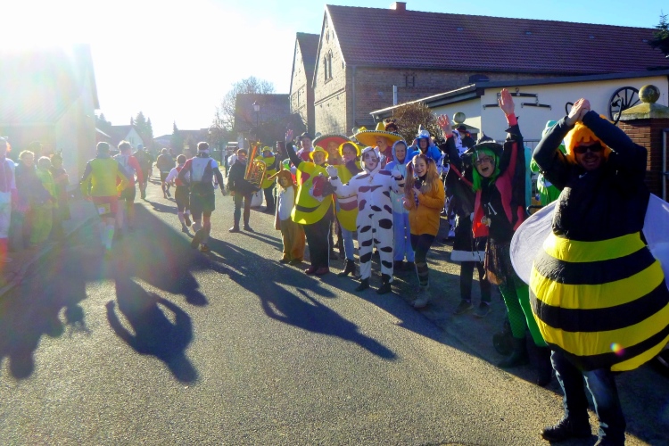 Am Start ist fast der ganze Ort auf den Beinen, bunt verkleidet und in bester Laune bei Musik und Tanz. Das hält warm. Ein kleines Schnäpsken kann das auch. Zamern heißt das, ist ein Brauch der hier ansässigen Sorben und Wenden und vertreibt schlechte Laune und den Winter gleich mit. Kirche, Museum, Denkmal, alles auf Ludwig Leichhardt abgestimmt. Noch ein Gruppenbild mit unserem Motto drauf und los geht’s, mit der Sonne immer von vorn. Gegenlicht, nicht gerade ideal für Fotos…
