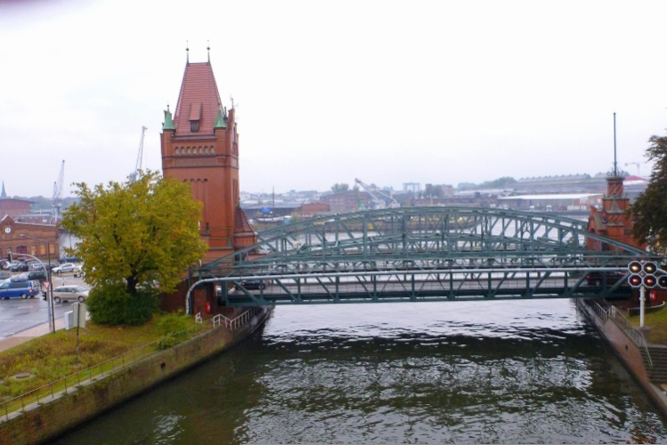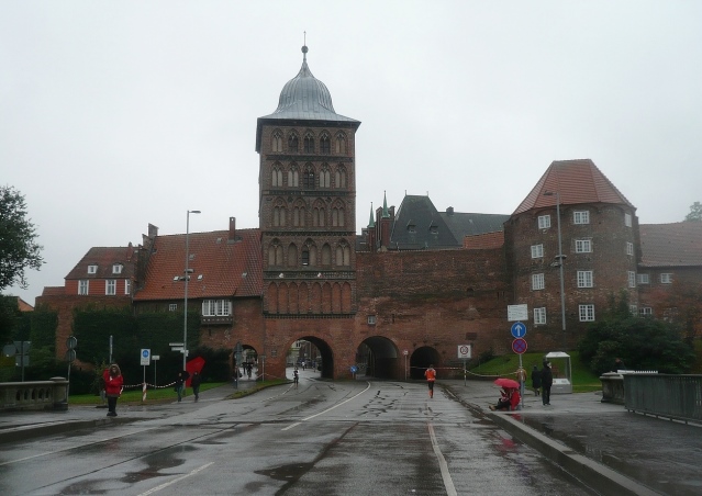 Die Große Burgstraße bringt uns dann zum Burgtor, das 1444 von Stadtbaumeister Nicolas Peck im spätgotischen Stil erbaut wurde. Neben dem Holstentor ist es das zweite noch erhaltene Stadttor der früheren Stadtbefestigung. Den Namen hat das Tor von der nebenan gelegenen Burg, die 1227 zum Burgkloster umgebaut wurde. Wir überlaufen die Stadttrave, rechterhand ist der Klughafen, links der Hansahafen zu sehen. Am folgenden Kreisverkehr am Gustav-Radbruch-Platz biegen wir in die Travemünder Allee ein, eine später vierspurige Straße.