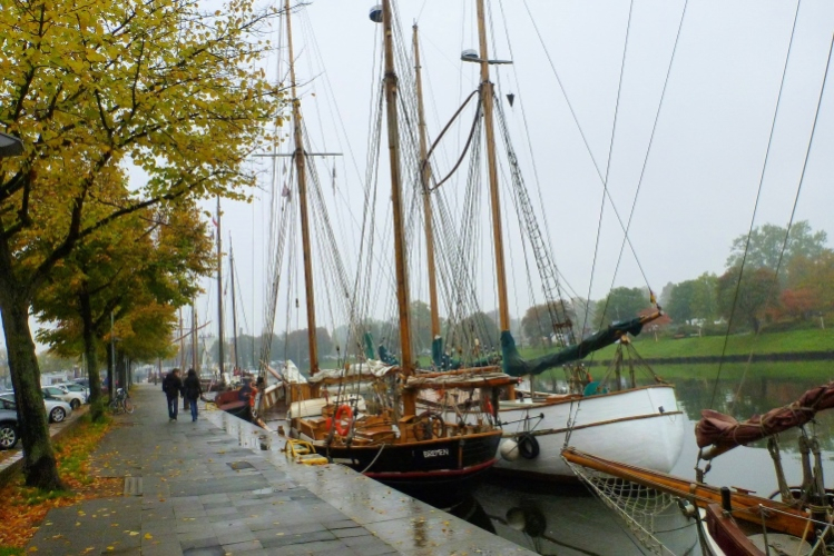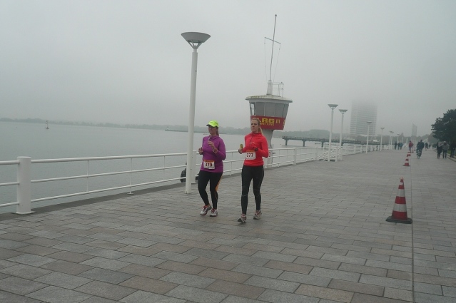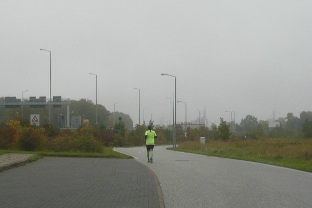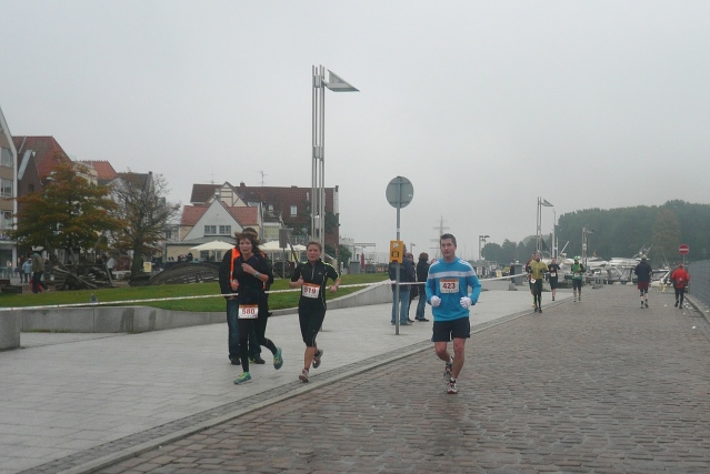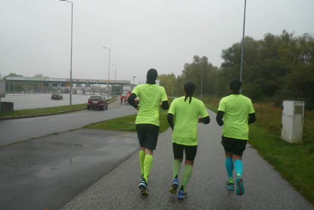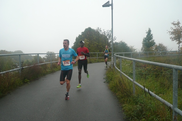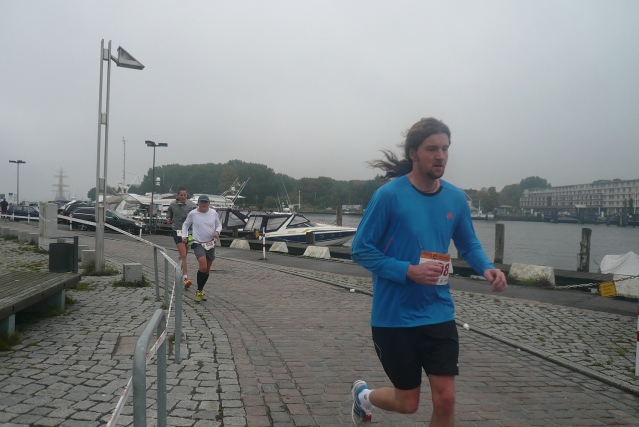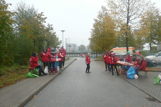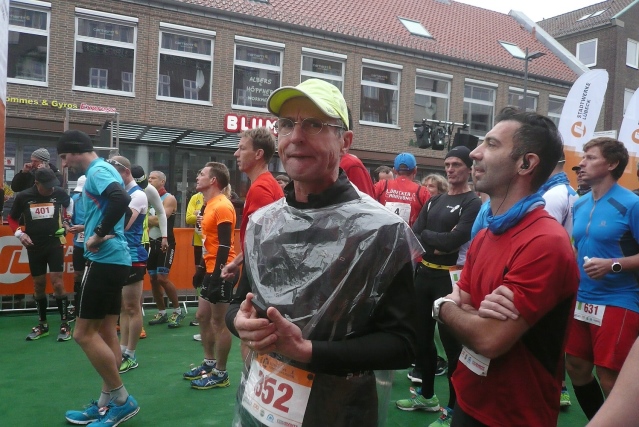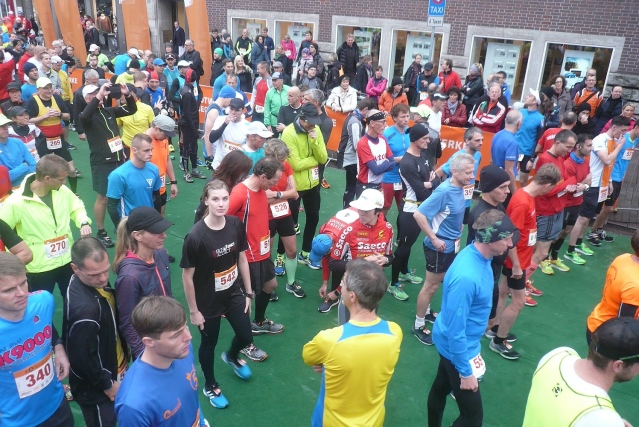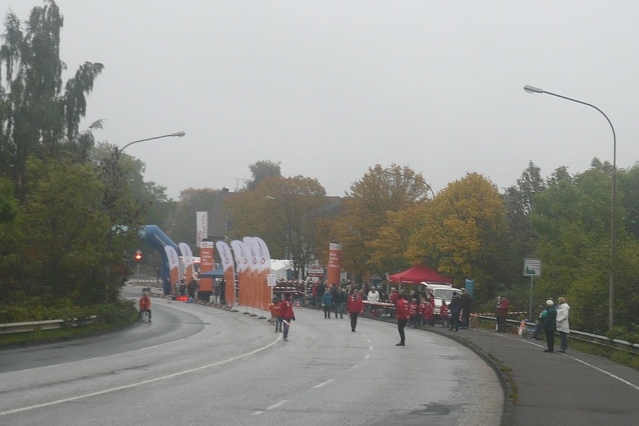 Am Sonntag früh ist die Sicht zum Fenster von der Jugendherberge hinaus nicht viel besser wie am Vortag. Zumindest ist es trocken, aber es ist mit acht Grad sehr kühl. Was also anziehen? Außerdem soll es im Laufe des Tages wieder regnen, gute Aussichten. Dick eingepackt begebe ich mich in Richtung Altstadt, wo sich im Haerder Center umgezogen werden kann. Eine Kleiderabgabe ist auch eingerichtet. Sehr positiv ist, dass man sich bis wenige Minuten vor dem Start dort im Warmen aufhalten kann. Das Gedränge hält sich in Grenzen, denn Punkt 10.00 Uhr starten die Marathonis, die anderen Läufer gehen später an den Start.