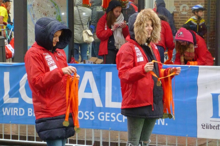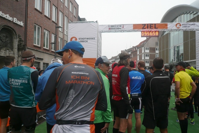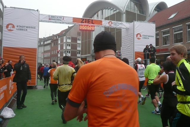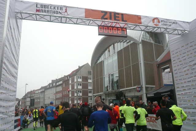 Vom Koberg, das brutale grobe Pflaster überwinde ich im Nu, geht es in die Breite Straße. Ein, zwei Mal muss ich mir mit meiner Stimme Platz unter den Halbmarathonis verschaffen. Der nun stattfindende Staffelmarathon auf einer rund zwei Kilometer langen Pendelstrecke ist im vollem Gang. Nur, die Staffelläufer sind mir eindeutig zu schnell. Dann sehe ich das Rathaus, das seit dem 12. Jahrhundert immer wieder ergänzt wurde. Am Vortag hatte ich mir das im Rahmen einer Besichtigung zeigen lassen. Das Cafe Niederegger liegt auf der anderen Seite. Dann schwenkt der Kurs nach rechts auf den Kohlmarkt. Ziellinie, Schluss, aus. Geschafft. Ich sehe eine 3.13 Stunden auf der Uhr. Perfekt, so schnell habe ich mir das nicht ausgerechnet.