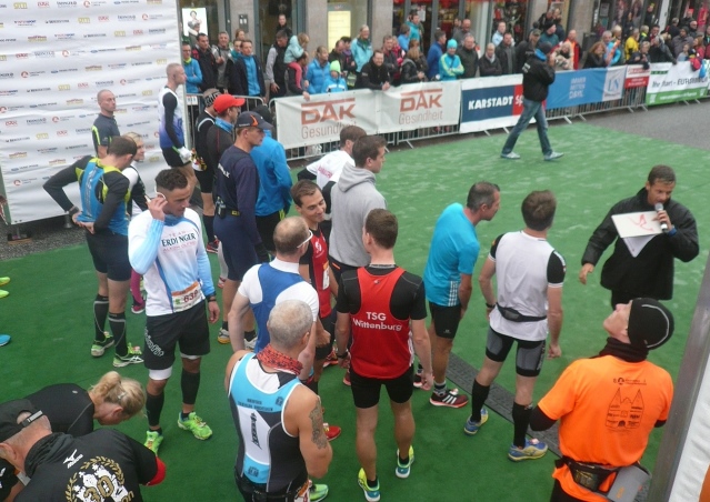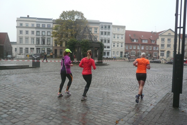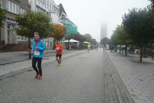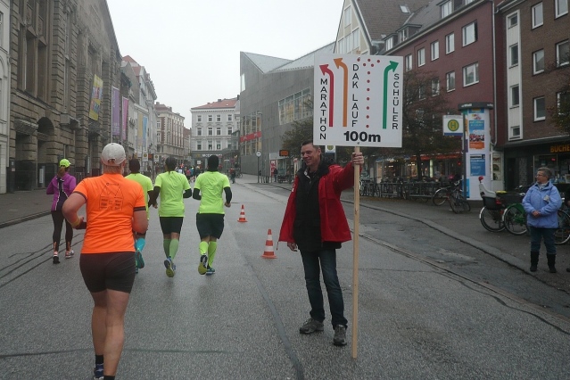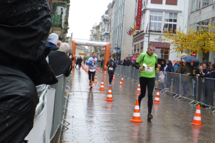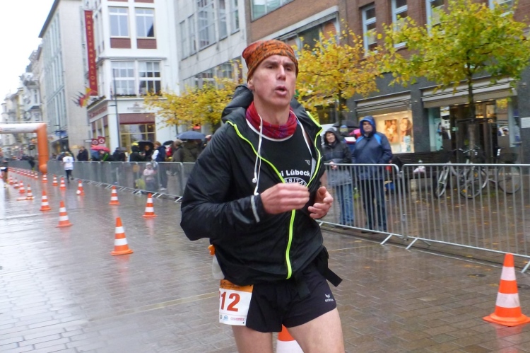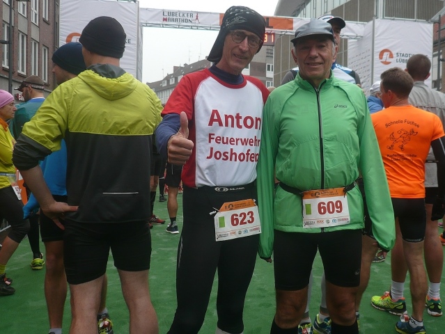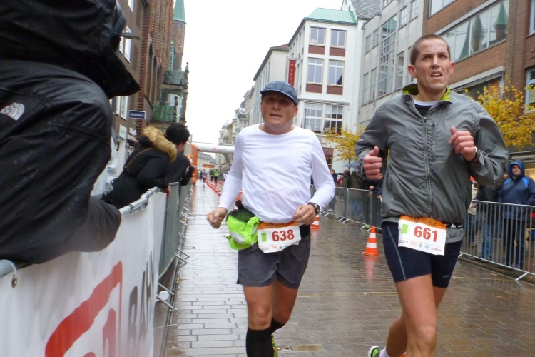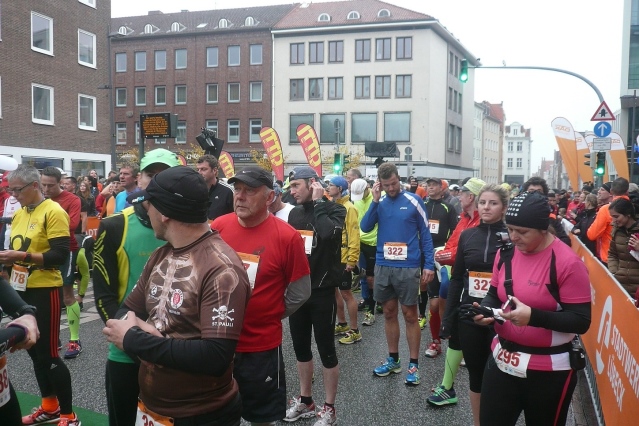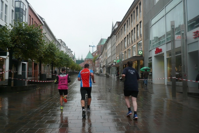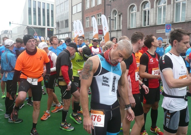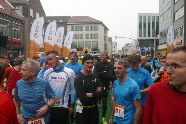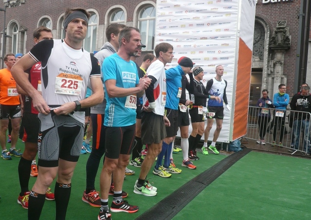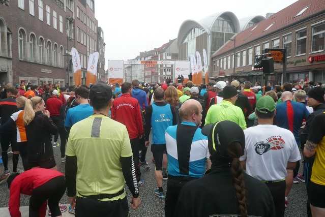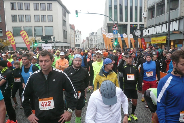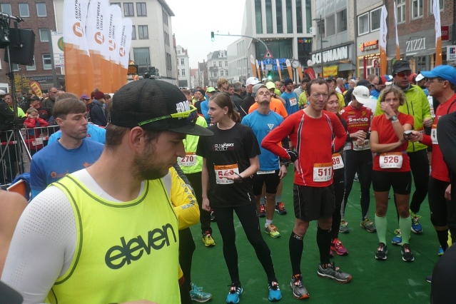Noch vor dem Startschuss läuft mir Bernd Neumann und Georg Brunner, Feuerwehrkamerad aus Offenbau, über den Weg. Nach kurzer Unterhaltung sucht sich jeder seinen Platz im Starterfeld auf dem Kohlmarkt. Über 400 Meldungen sind für den Marathon eingegangen. Ich vermute, dass da der eine oder andere wegen des „Schietwetters“ gekniffen hat. Es reicht dennoch für eine neue Rekordbeteiligung, denn rund 4000 Läufer stehen insgesamt in den Listen.